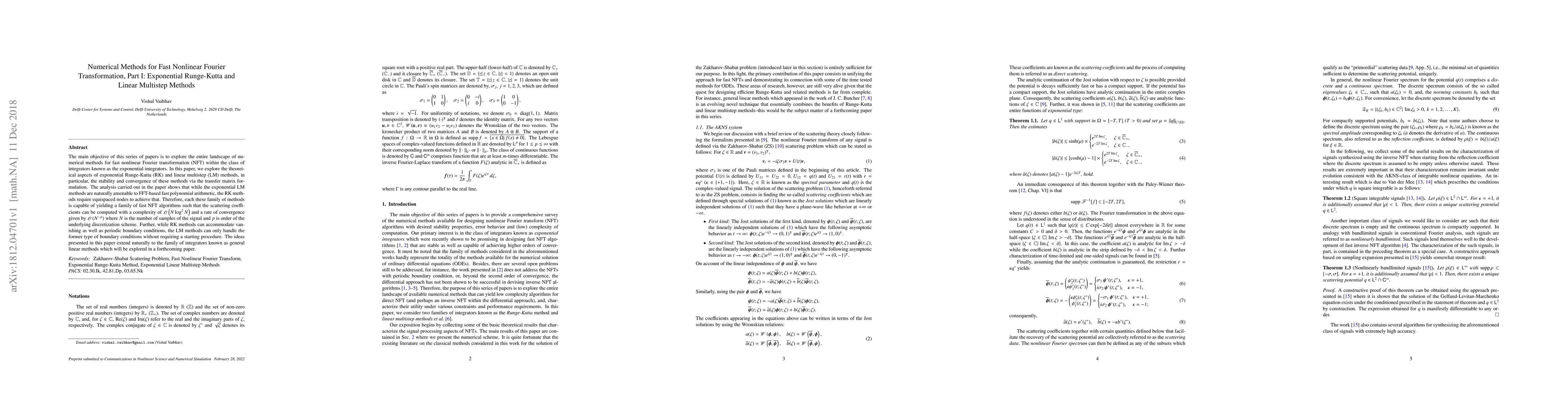 The main objective of this series of papers is to explore the entire landscape of numerical methods for fast nonlinear Fourier transformation (NFT) within the class of integrators known as the exponential integrators. In this paper, we explore the theoretical aspects of exponential Runge-Kutta (RK) and linear multistep (LM) methods, in particular, the stability and convergence of these methods via the transfer matrix formulation. The analysis carried out in the paper shows that while the exponential LM methods are naturally amenable to FFT-based fast polynomial arithmetic, the RK methods require equispaced nodes to achieve that. Therefore, each these family of methods is capable of yielding a family of fast NFT algorithms such that the scattering coefficients can be computed with a complexity of $\mathscr{O}(N\log^2N)$ and a rate of convergence given by $\mathscr{O}(N^{-p})$ where $N$ is the number of samples of the signal and $p$ is order of the underlying discretization scheme. Further, while RK methods can accommodate vanishing as well as periodic boundary conditions, the LM methods can only handle the former type of boundary conditions without requiring a starting procedure. The ideas presented in this paper extend naturally to the family of integrators known as general linear methods which will be explored in a forthcoming paper.