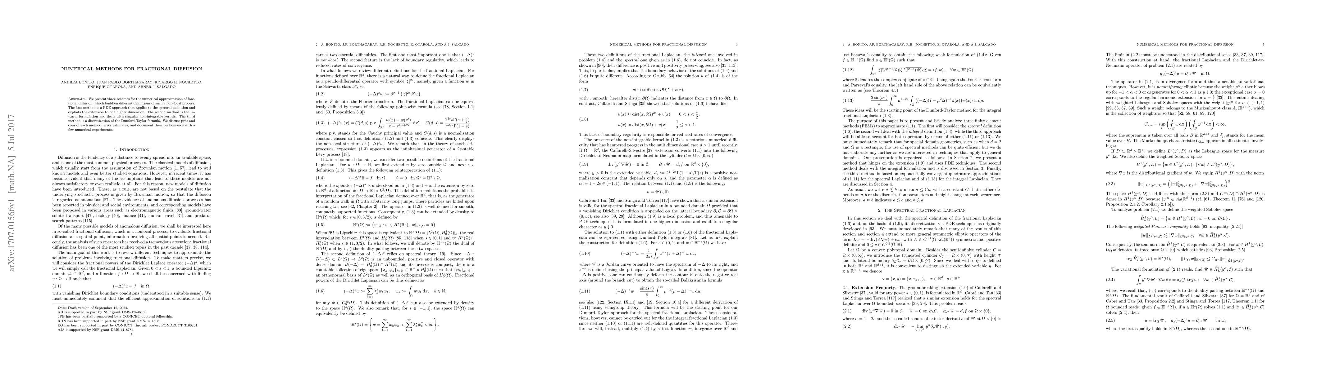 This paper introduces three numerical schemes for approximating fractional diffusion, each based on different definitions of the non-local process. The methods include a PDE approach, an integral formulation, and a discretization of the Dunford-Taylor formula, with detailed discussions on their advantages, error estimates, and performance through numerical experiments.