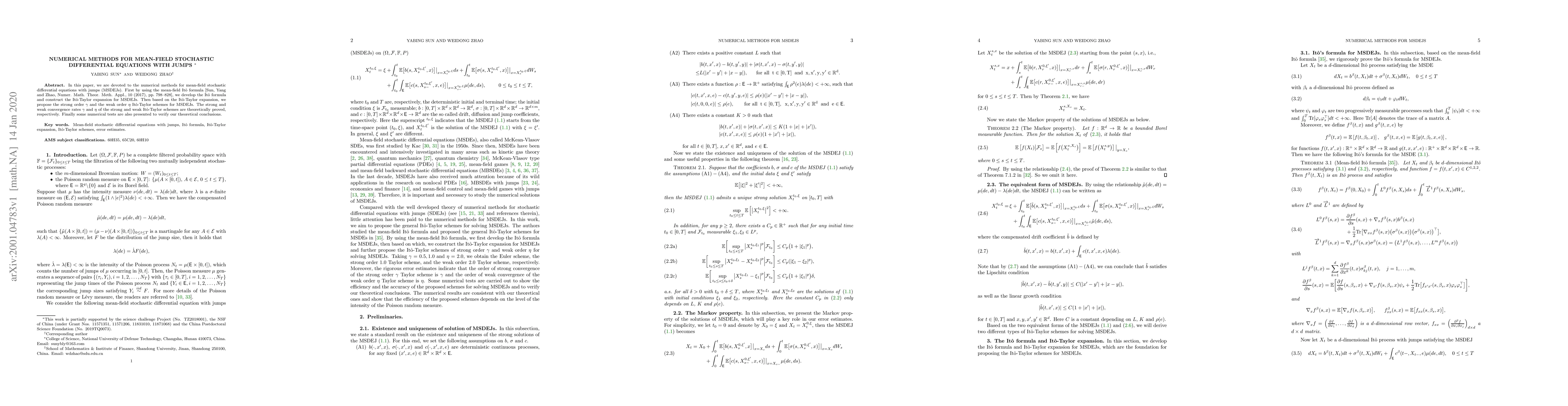 This paper develops numerical methods for mean-field stochastic differential equations with jumps (MSDEJs), constructing an Itô-Taylor expansion and proposing strong and weak Itô-Taylor schemes. Theoretical convergence rates are proven, and numerical tests validate the proposed methods.