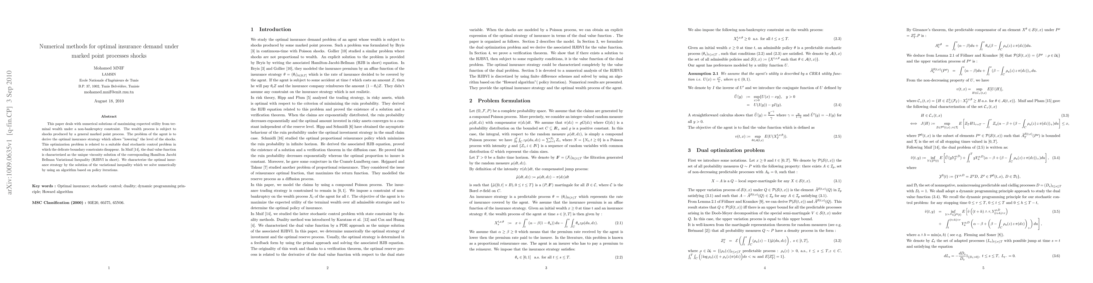 This paper deals with numerical solutions of maximizing expected utility from terminal wealth under a non-bankruptcy constraint. The wealth process is subject to shocks produced by a general marked point process. The problem of the agent is to derive the optimal insurance strategy which allows "lowering" the level of the shocks. This optimization problem is related to a suitable dual stochastic control problem in which the delicate boundary constraints disappear. In Mnif \cite{mnif10}, the dual value function is characterized as the unique viscosity solution of the corresponding Hamilton Jacobi Bellman Variational Inequality (HJBVI in short). We characterize the optimal insurance strategy by the solution of the variational inequality which we solve numerically by using an algorithm based on policy iterations.