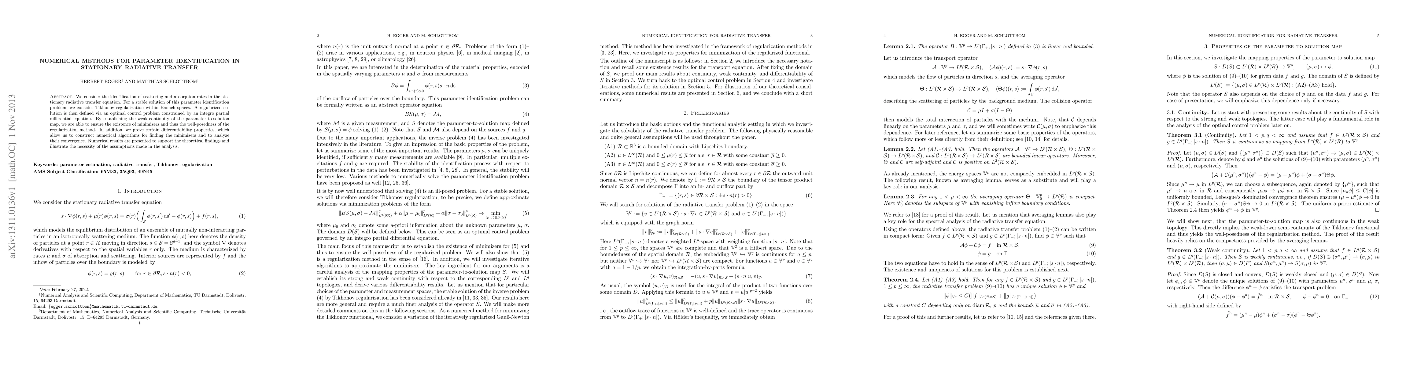 This paper develops a method for identifying scattering and absorption rates in radiative transfer using Tikhonov regularization and optimal control problems, ensuring the existence of minimizers and analyzing their convergence through weak-continuity properties.
