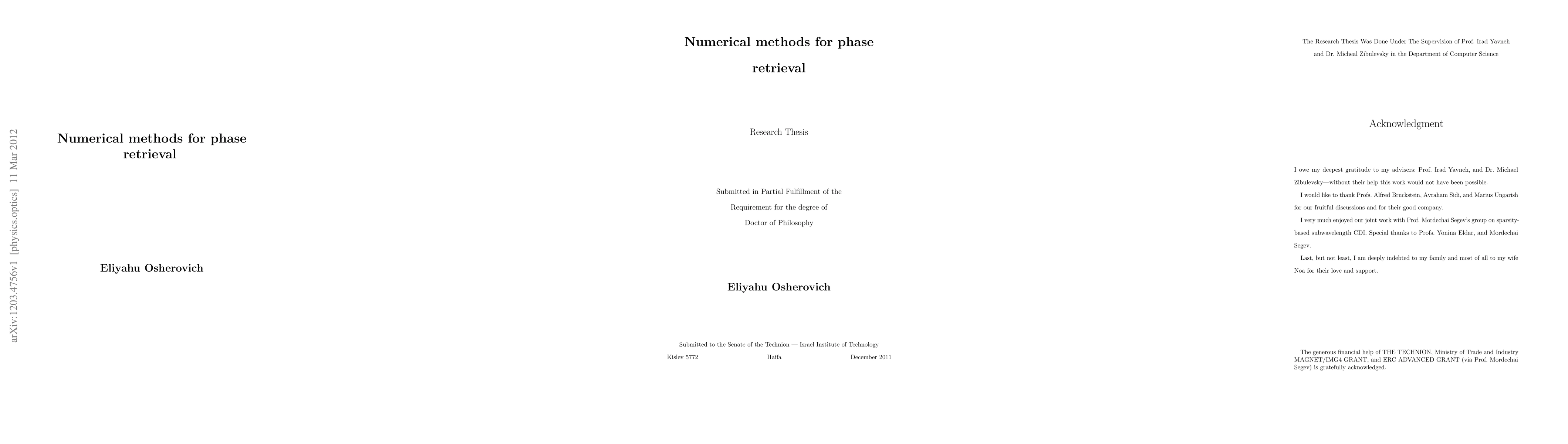 In this work we consider the problem of reconstruction of a signal from the magnitude of its Fourier transform, also known as phase retrieval. The problem arises in many areas of astronomy, crystallography, optics, and coherent diffraction imaging (CDI). Our main goal is to develop an efficient reconstruction method based on continuous optimization techniques. Unlike current reconstruction methods, which are based on alternating projections, our approach leads to a much faster and more robust method. However, all previous attempts to employ continuous optimization methods, such as Newton-type algorithms, to the phase retrieval problem failed. In this work we provide an explanation for this failure, and based on this explanation we devise a sufficient condition that allows development of new reconstruction methods---approximately known Fourier phase. We demonstrate that a rough (up to $\pi/2$ radians) Fourier phase estimate practically guarantees successful reconstruction by any reasonable method. We also present a new reconstruction method whose reconstruction time is orders of magnitude faster than that of the current method-of-choice in phase retrieval---Hybrid Input-Output (HIO). Moreover, our method is capable of successful reconstruction even in the situations where HIO is known to fail. We also extended our method to other applications: Fourier domain holography, and interferometry. Additionally we developed a new sparsity-based method for sub-wavelength CDI. Using this method we demonstrated experimental resolution exceeding several times the physical limit imposed by the diffraction light properties (so called diffraction limit).