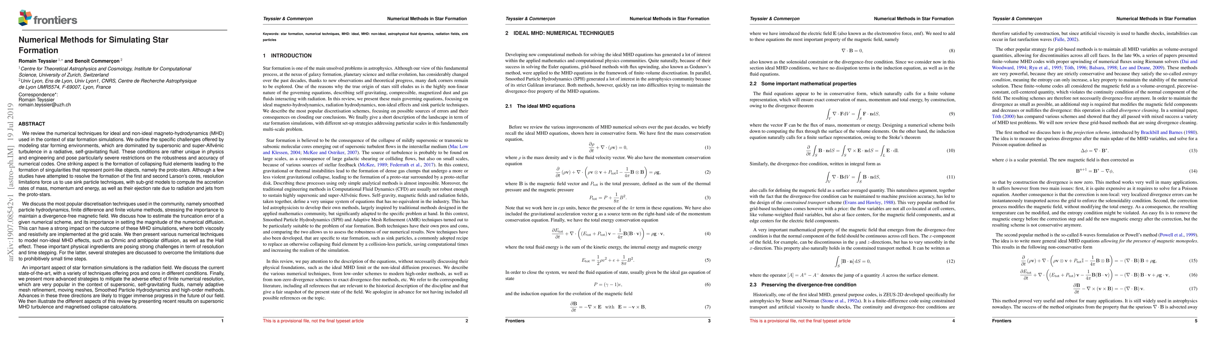 We review the numerical techniques for ideal and non-ideal magneto-hydrodynamics (MHD) used in the context of star formation simulations. We outline the specific challenges offered by modeling star forming environments, which are dominated by supersonic and super-Alfvenic turbulence in a radiative, self-gravitating fluid. These conditions are rather unique in physics and engineering and pose particularly severe restrictions on the robustness and accuracy of numerical codes. One striking aspect is the formation of collapsing fluid elements leading to the formation of singularities that represent point-like objects, namely the proto-stars. Although a few studies have attempted to resolve the formation of the first and second Larson cores, resolution limitations force us to use sink particle techniques, with sub-grid models to compute the accretion rates of mass, momentum and energy, as well as their ejection rate due to radiation and jets from the proto-stars. We discuss the most popular discretisation techniques used in the community, namely smoothed particle hydrodynamics, finite difference and finite volume methods, stressing the importance to maintain a divergence-free magnetic field. We discuss how to estimate the truncation error of a given numerical scheme, and its importance in setting the magnitude of the numerical diffusion. This can have a strong impact on the outcome of these MHD simulations, where both viscosity and resistivity are implemented at the grid scale. We then present various numerical techniques to model non-ideal MHD effects, such as Ohmic and ambipolar diffusion, as well as the Hall effect. These important physical ingredients are posing strong challenges in term of resolution and time stepping. For the latter, several strategies are discussed to overcome the limitations due to prohibitively small time steps (abridged).