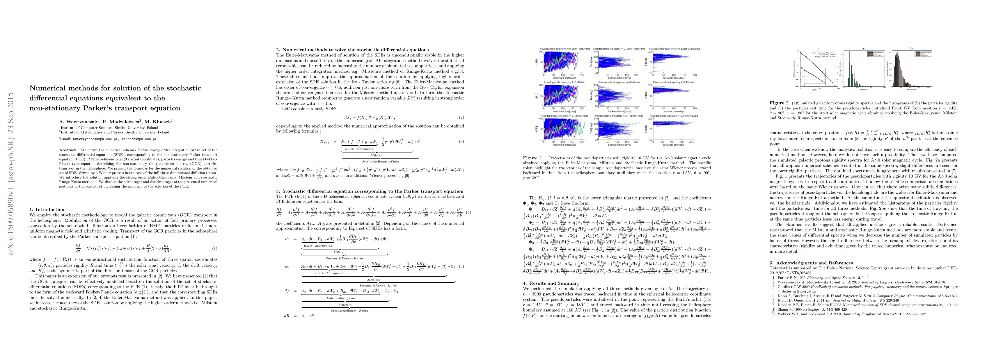 This paper develops numerical schemes for solving the stochastic differential equations (SDEs) associated with the non-stationary Parker transport equation (PTE), which models galactic cosmic ray particle transport in the heliosphere. It presents strong order integration methods, including Euler-Maruyama, Milstein, and stochastic Runge-Kutta, and discusses their respective advantages and disadvantages in terms of accuracy.