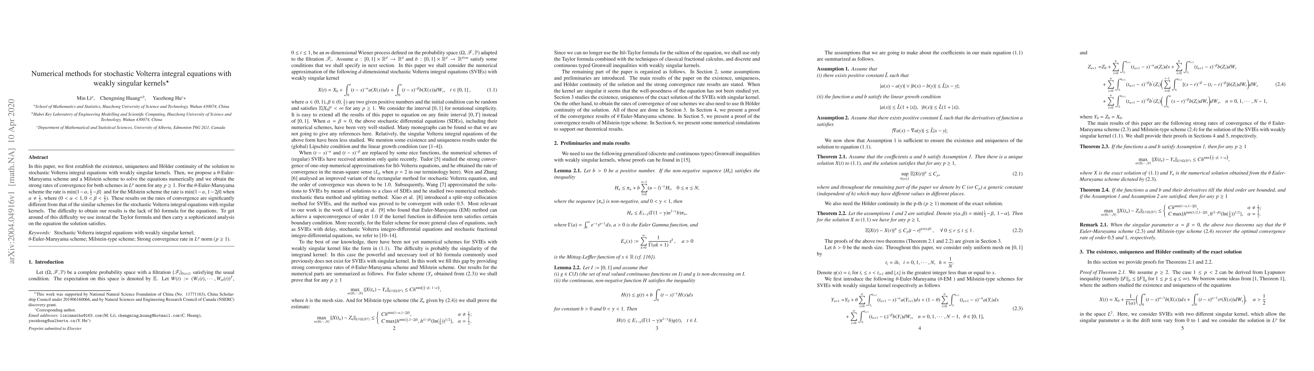 In this paper, we first establish the existence, uniqueness and H\"older continuity of the solution to stochastic Volterra integral equations with weakly singular kernels. Then, we propose a $\theta$-Euler-Maruyama scheme and a Milstein scheme to solve the equations numerically and we obtain the strong rates of convergence for both schemes in $L^{p}$ norm for any $p\geq 1$. For the $\theta$-Euler-Maruyama scheme the rate is $\min\{1-\alpha,\frac{1}{2}-\beta\}~ % (0<\alpha<1, 0< \beta<\frac{1}{2})$ and for the Milstein scheme the rate is $\min\{1-\alpha,1-2\beta\}$ when $\alpha\neq \frac 12$, where $(0<\alpha<1, 0< \beta<\frac{1}{2})$. These results on the rates of convergence are significantly different from that of the similar schemes for the stochastic Volterra integral equations with regular kernels. The difficulty to obtain our results is the lack of It\^o formula for the equations. To get around of this difficulty we use instead the Taylor formula and then carry a sophisticated analysis on the equation the solution satisfies.