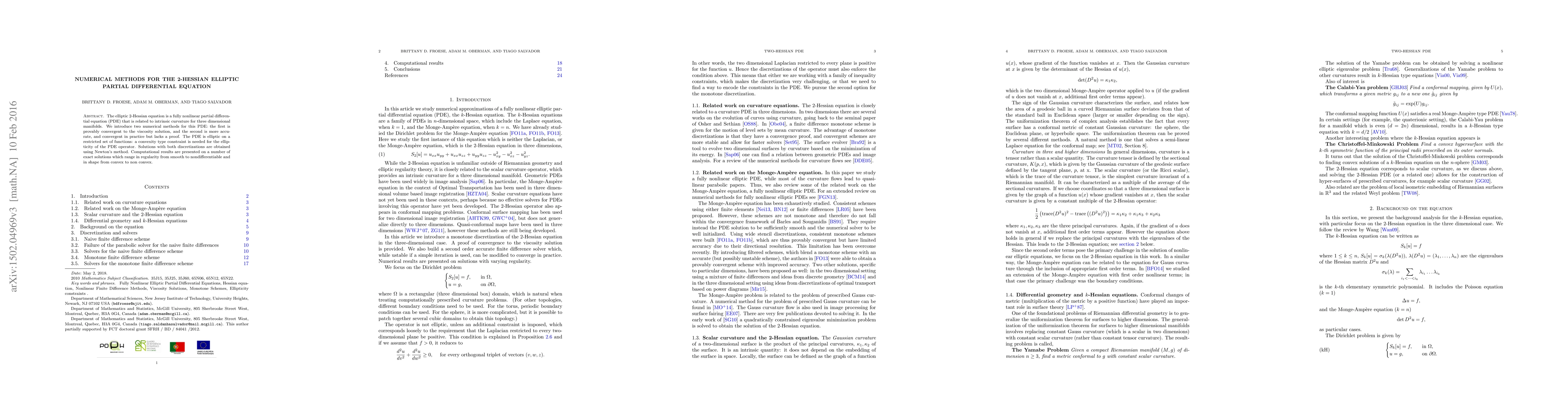 The elliptic 2-Hessian equation is a fully nonlinear partial differential equation (PDE) that is related to intrinsic curvature for three dimensional manifolds. We introduce two numerical methods for this PDE: the first is provably convergent to the viscosity solution, and the second is more accurate, and convergent in practice but lacks a proof. The PDE is elliptic on a restricted set of functions: a convexity type constraint is needed for the ellipticity of the PDE operator. Solutions with both discretizations are obtained using Newton's method. Computational results are presented on a number of exact solutions which range in regularity from smooth to nondifferentiable and in shape from convex to non convex.