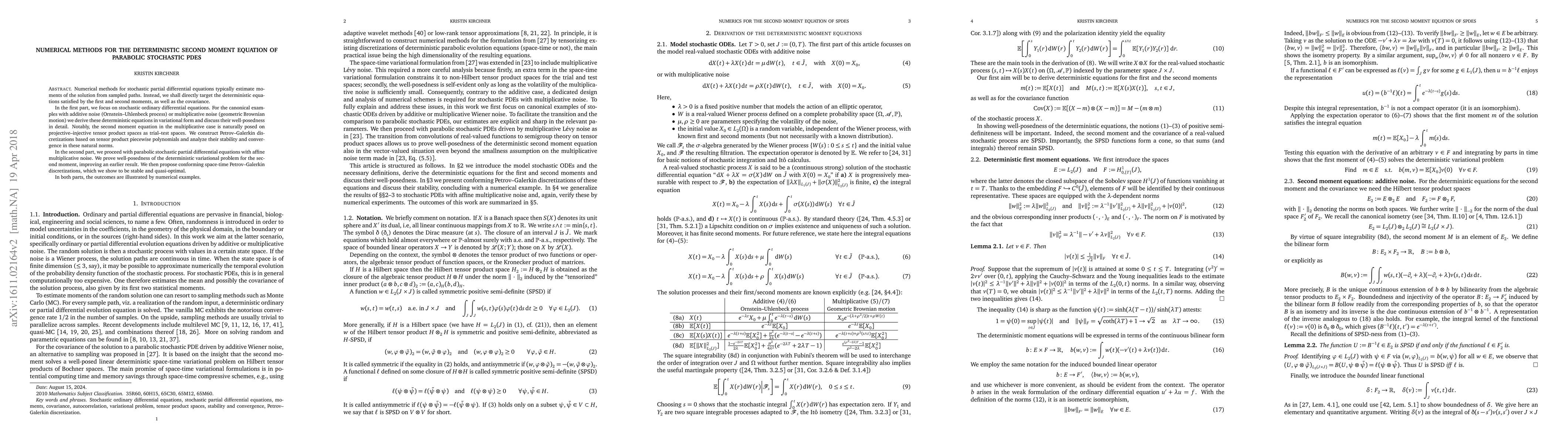 This paper develops numerical methods for deterministic equations governing the first and second moments of solutions to stochastic ordinary and partial differential equations. It constructs Petrov-Galerkin discretizations for both additive and multiplicative noise cases, proving stability and convergence, and extends these methods to parabolic stochastic PDEs with affine multiplicative noise.