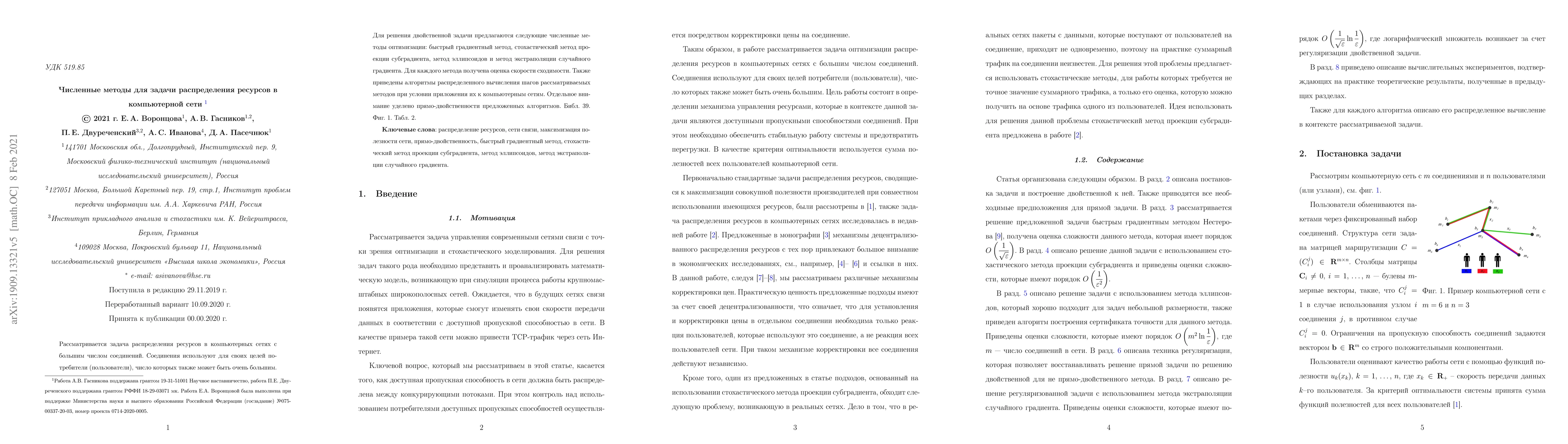 In this paper, we consider the resource allocation problem in a network with a large number of connections which are used by a huge number of users. The resource allocation problem under discussion is a maximization problem with linear inequality constraints. To solve this problem we construct the dual problem and propose to use the following numerical optimization methods for the dual: a fast gradient method, a stochastic projected subgradient method, an ellipsoid method, and a random gradient extrapolation method. A special focus is made on the primal-dual analysis of these methods. For each method we estimate the convergence rate. We also provide some modifications of these methods in the setup of distributed computations, taking into account their application to networks.