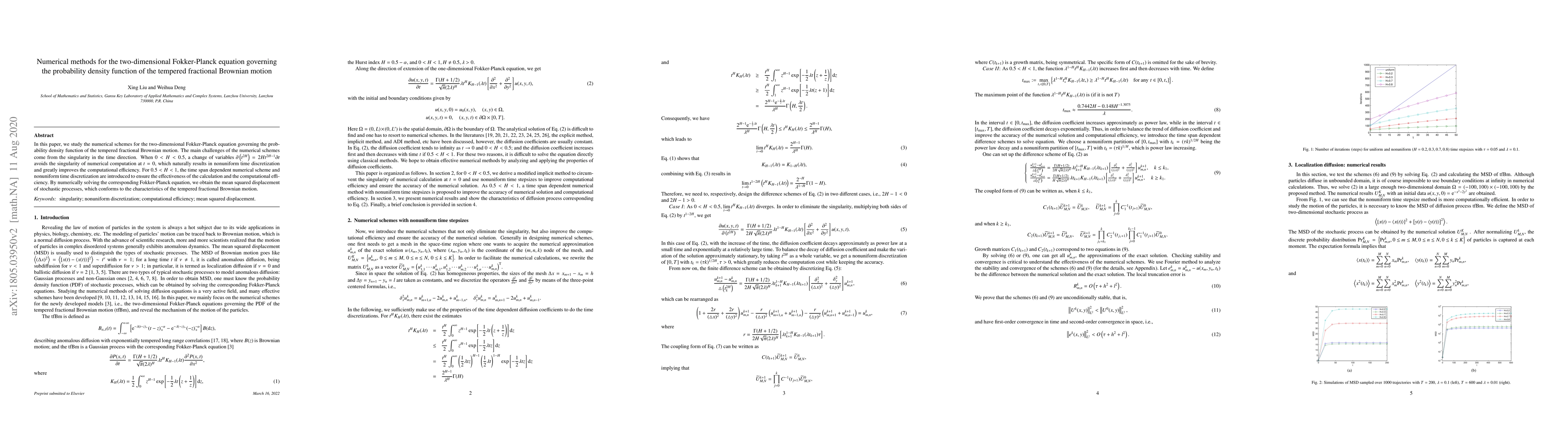 This paper develops numerical methods for solving the two-dimensional Fokker-Planck equation associated with tempered fractional Brownian motion, addressing the singularity in the time direction. It introduces a change of variables for $0<H<0.5$ and a time span dependent scheme for $0.5<H<1$, both employing nonuniform time discretization to enhance computational efficiency and accuracy.