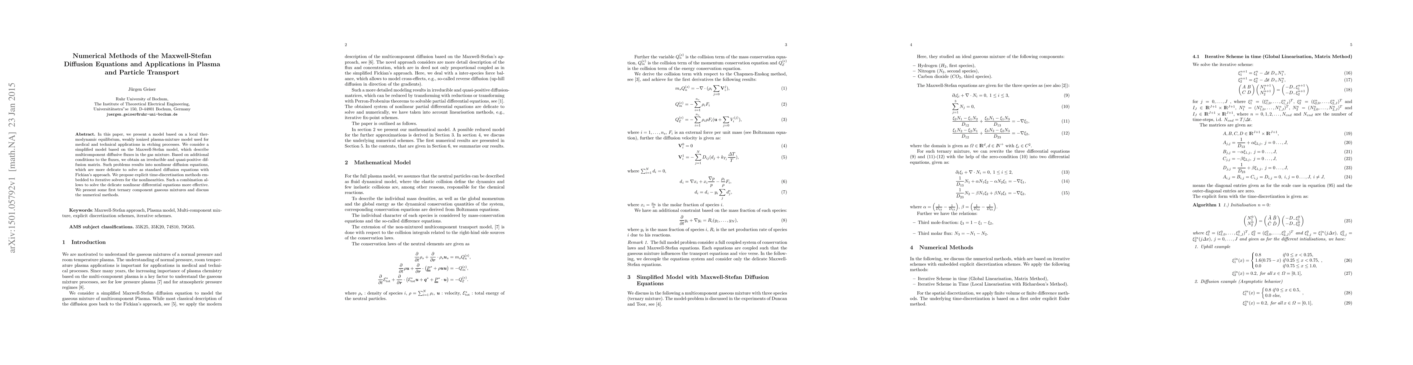 In this paper, we present a model based on a local thermodynamic equilibrium, weakly ionized plasma-mixture model used for medical and technical applications in etching processes. We consider a simplified model based on the Maxwell-Stefan model, which describe multicomponent diffusive fluxes in the gas mixture. Based on additional conditions to the fluxes, we obtain an irreducible and quasi-positive diffusion matrix. Such problems results into nonlinear diffusion equations, which are more delicate to solve as standard diffusion equations with Fickian's approach. We propose explicit time-discretisation methods embedded to iterative solvers for the nonlinearities. Such a combination allows to solve the delicate nonlinear differential equations more effective. We present some first ternary component gaseous mixtures and discuss the numerical methods.