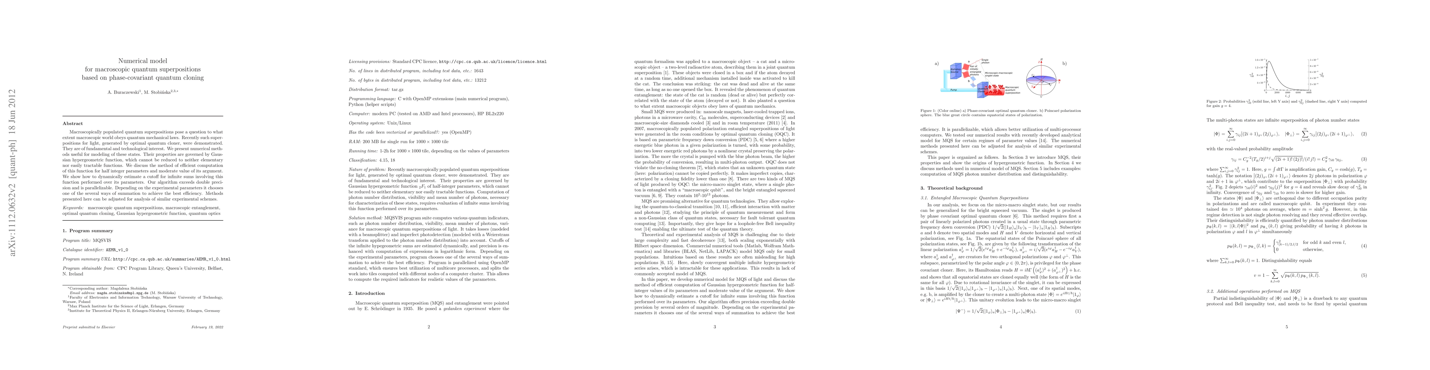 This paper presents numerical methods for modeling macroscopic quantum superpositions, focusing on phase-covariant quantum cloning. It introduces an efficient algorithm for computing Gaussian hypergeometric functions, which governs the properties of these states, and discusses dynamic cutoff estimation for infinite sums, achieving high precision and parallelizability.