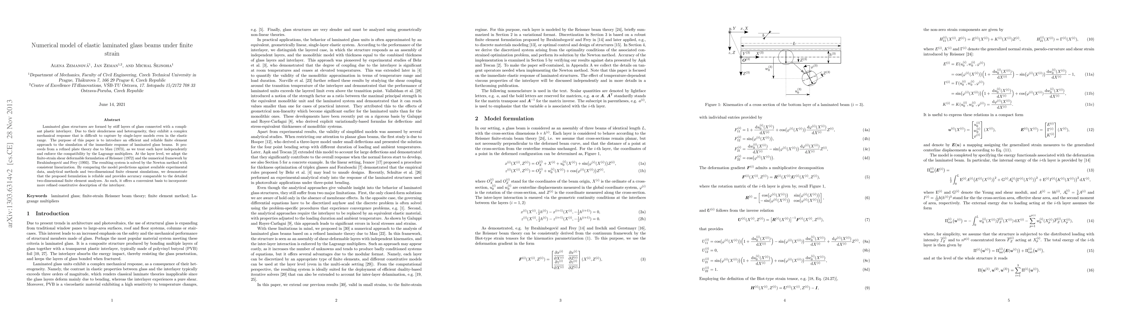 This paper introduces a refined finite element model for simulating the elastic behavior of laminated glass beams under finite strain, utilizing a shear deformable formulation and Lagrange multipliers for compatibility enforcement. The proposed method demonstrates high accuracy and reliability through comparisons with experimental and analytical data.