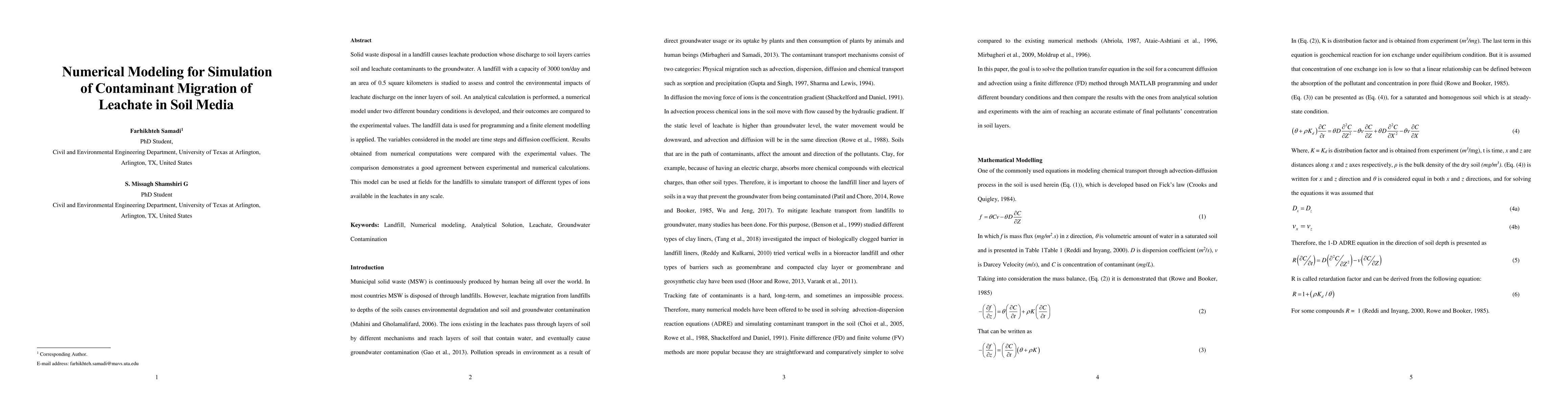 Solid waste disposal in a landfill causes leachate production whose discharge to soil layers carries soil and leachate contaminants to the groundwater. A landfill with a capacity of 3000 ton/day and an area of 0.5 square kilometers is studied to assess and control the environmental impacts of leachate discharge on the inner layers of soil. An analytical calculation is performed, a numerical model under two different boundary conditions is developed, and their outcomes are compared to the experimental values. The landfill data is used for programming and a finite element modelling is applied. The variables considered in the model are time steps and diffusion coefficient. Results obtained from numerical computations were compared with the experimental values. The comparison demonstrates a good agreement between experimental and numerical calculations. This model can be used at fields for the landfills to simulate transport of different types of ions available in the leachates in any scale.