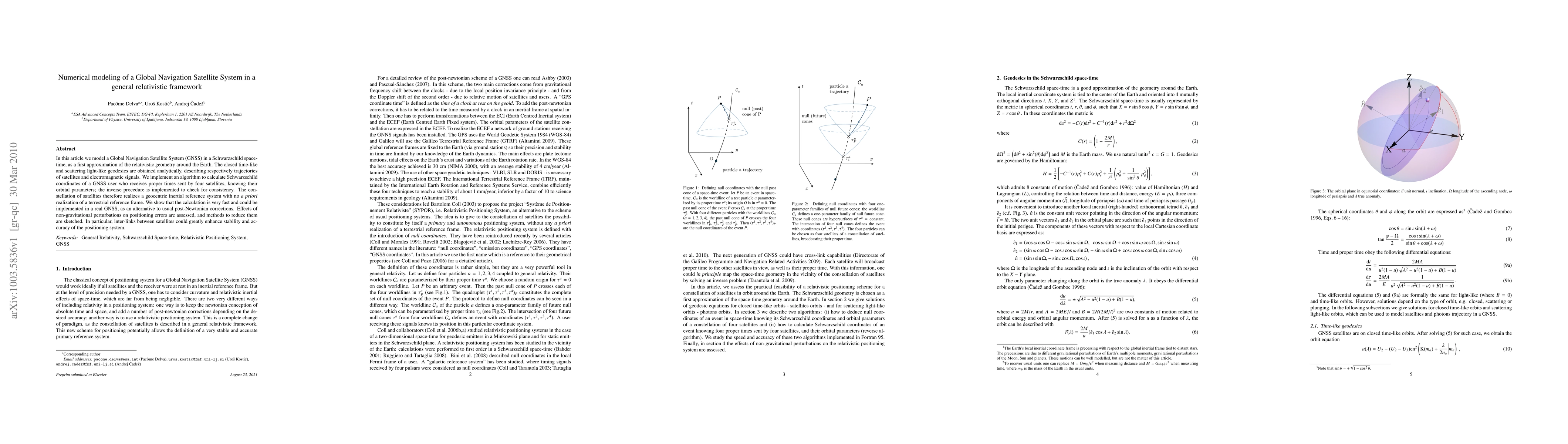 This paper models a Global Navigation Satellite System (GNSS) using a general relativistic framework based on Schwarzschild space-time, analyzing satellite and signal paths. It proposes an efficient algorithm for real-time GNSS calculations, suggesting inter-satellite links could improve accuracy and stability.