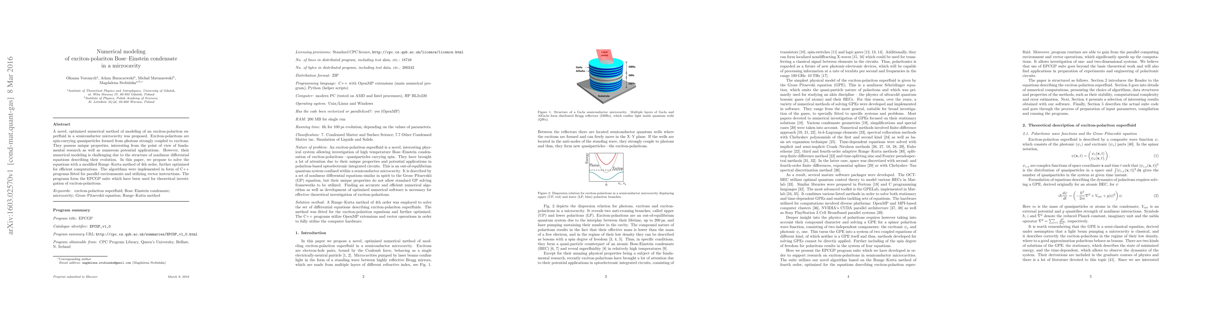 The paper presents an optimized numerical method and a C++ suite (EPCGP) for modeling exciton-polariton superfluids, utilizing the Runge-Kutta algorithm and parallel computing.