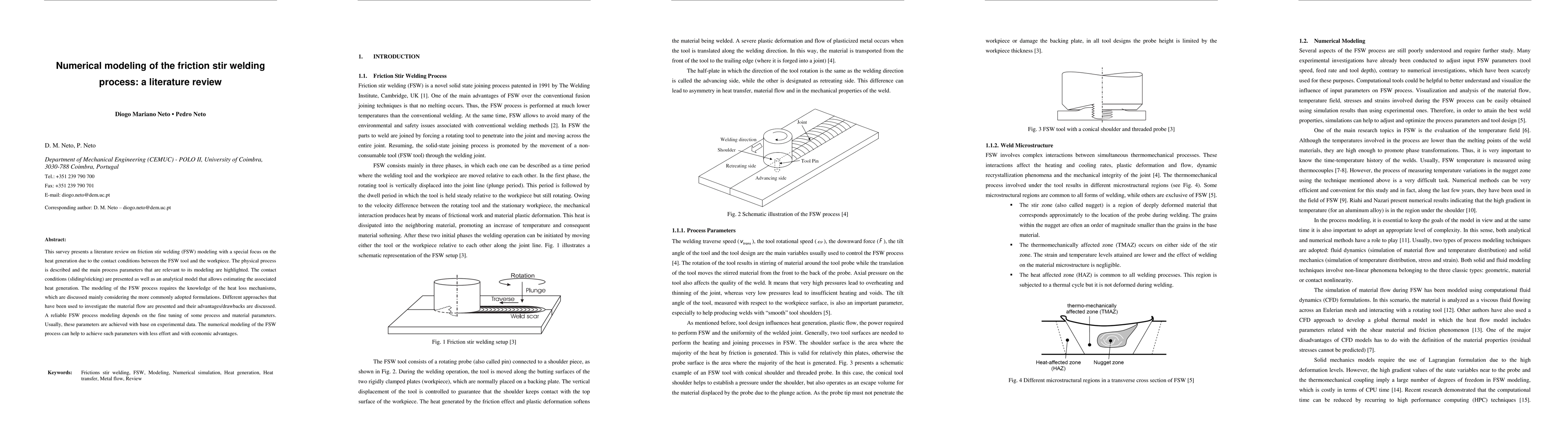 This literature review examines numerical models for friction stir welding, focusing on heat generation from tool-workpiece contact and the modeling of material flow. It highlights the importance of fine-tuning process parameters for reliable modeling, noting that numerical simulations can reduce experimental effort and costs.