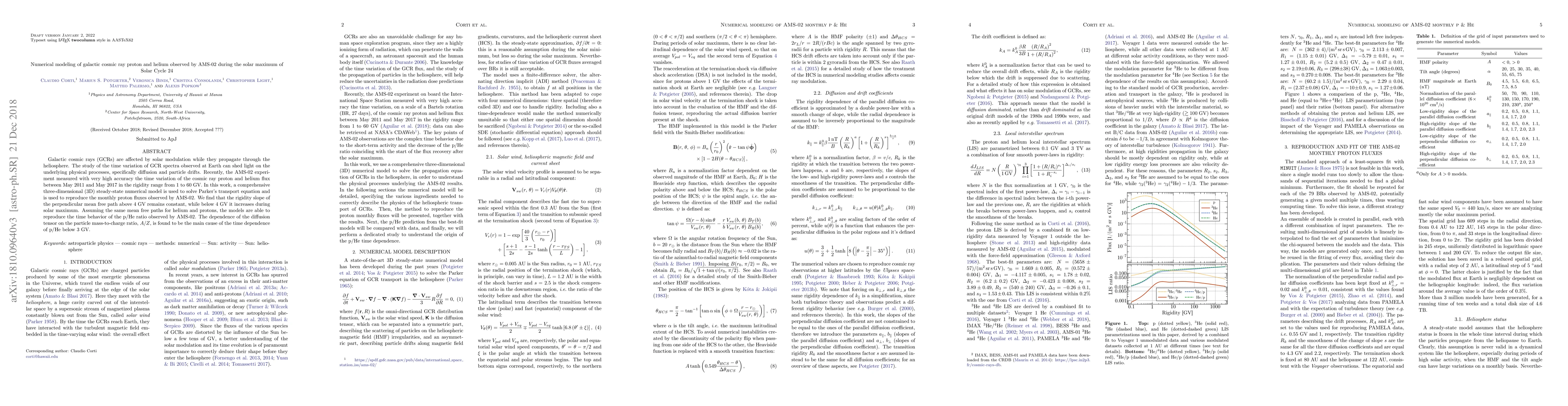 This paper uses a 3D numerical model to analyze galactic cosmic ray protons and helium observed by AMS-02 during Solar Cycle 24's maximum, finding constant rigidity slope above 4 GV and increasing slope below 4 GV. The model reproduces the observed p/He ratio, attributing the time dependence to the diffusion tensor's dependence on mass-to-charge ratio.