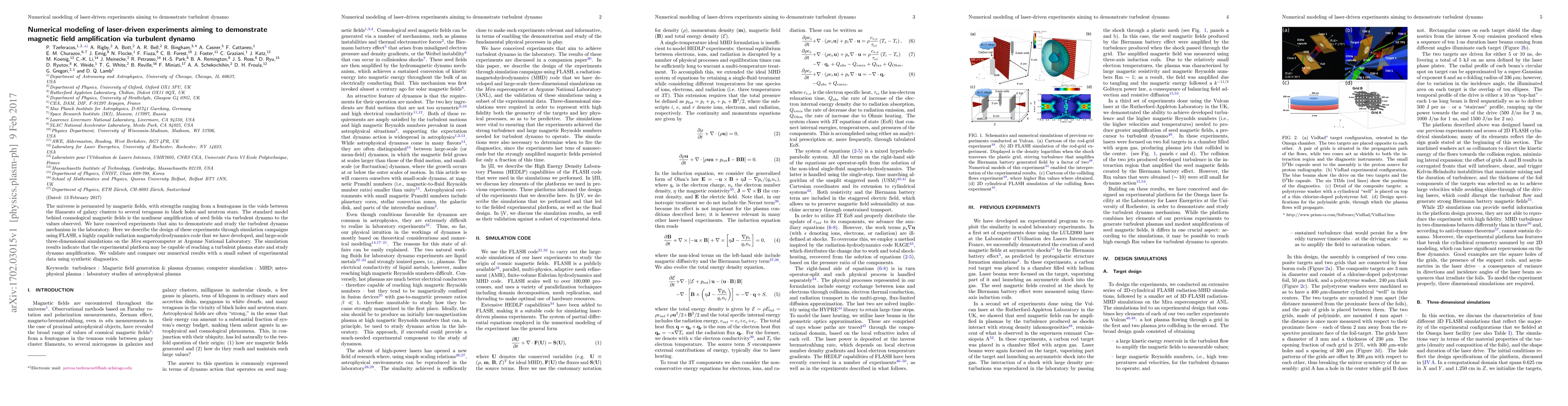The universe is permeated by magnetic fields, with strengths ranging from a femtogauss in the voids between the filaments of galaxy clusters to several teragauss in black holes and neutron stars. The standard model behind cosmological magnetic fields is the nonlinear amplification of seed fields via turbulent dynamo to the values observed. We have conceived experiments that aim to demonstrate and study the turbulent dynamo mechanism in the laboratory. Here we describe the design of these experiments through simulation campaigns using FLASH, a highly capable radiation magnetohydrodynamics code that we have developed, and large-scale three-dimensional simulations on the Mira supercomputer at Argonne National Laboratory. The simulation results indicate that the experimental platform may be capable of reaching a turbulent plasma state and study dynamo amplification. We validate and compare our numerical results with a small subset of experimental data using synthetic diagnostics.