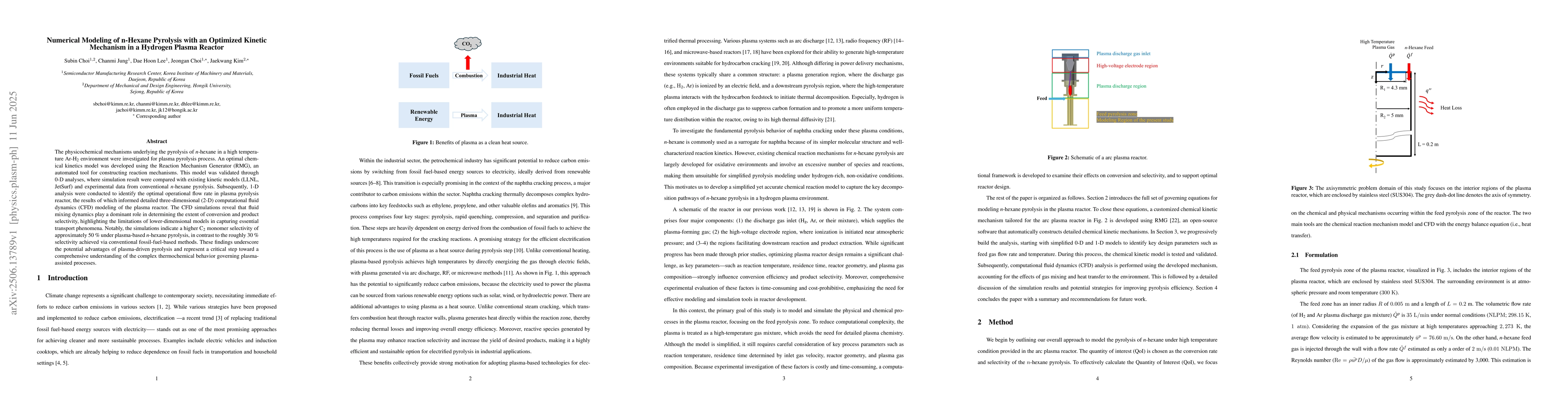 This research optimizes a kinetic mechanism for n-hexane pyrolysis in a hydrogen plasma reactor using RMG. 1D and 3D CFD modeling reveal that plasma pyrolysis offers higher C2 monomer selectivity (50%) compared to conventional methods (30%), highlighting plasma's potential in pyrolysis processes.