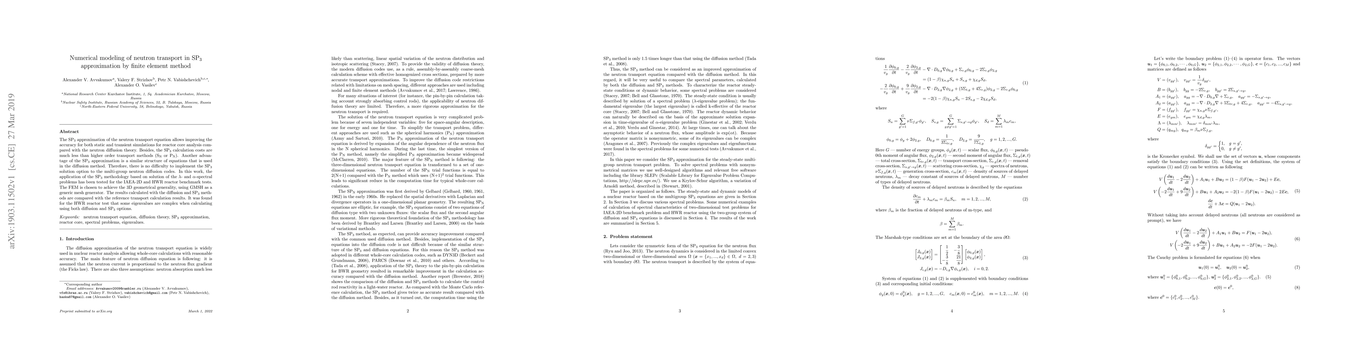 The SP3 approximation of the neutron transport equation allows improving the accuracy for both static and transient simulations for reactor core analysis compared with the neutron diffusion theory. Besides, the SP3 calculation costs are much less than higher order transport methods (SN or PN). Another advantage of the SP3 approximation is a similar structure of equations that is used in the diffusion method. Therefore, there is no difficulty to implement the SP3 solution option to the multi-group neutron diffusion codes. In this work, the application of the SP3 methodology based on solution of the {\lambda}- and {\alpha}-spectral problems has been tested for the IAEA-2D and HWR reactor benchmark tests. The FEM is chosen to achieve the 3D geometrical generality, using GMSH as a generic mesh generator. The results calculated with the diffusion and SP3 methods are compared with the reference transport calculation results. It was found for the HWR reactor test that some eigenvalues are complex when calculating using both diffusion and SP3 options.