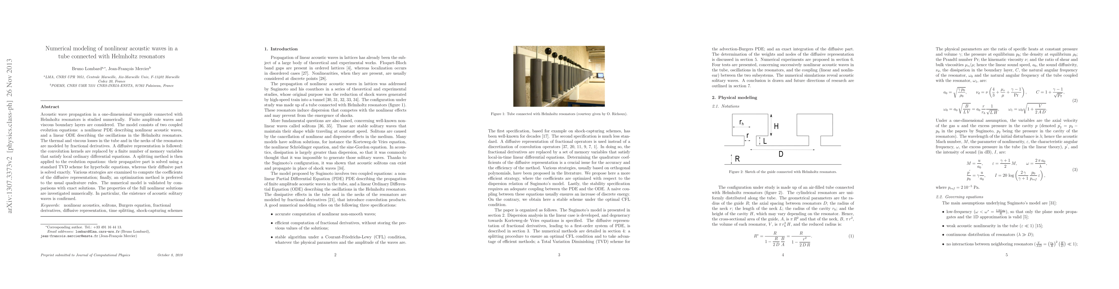 This paper numerically models nonlinear acoustic waves in a tube connected to Helmholtz resonators, considering finite amplitude waves and viscous boundary layers. The model employs a splitting method to solve coupled evolution equations, confirming the existence of acoustic solitary waves through numerical validation.