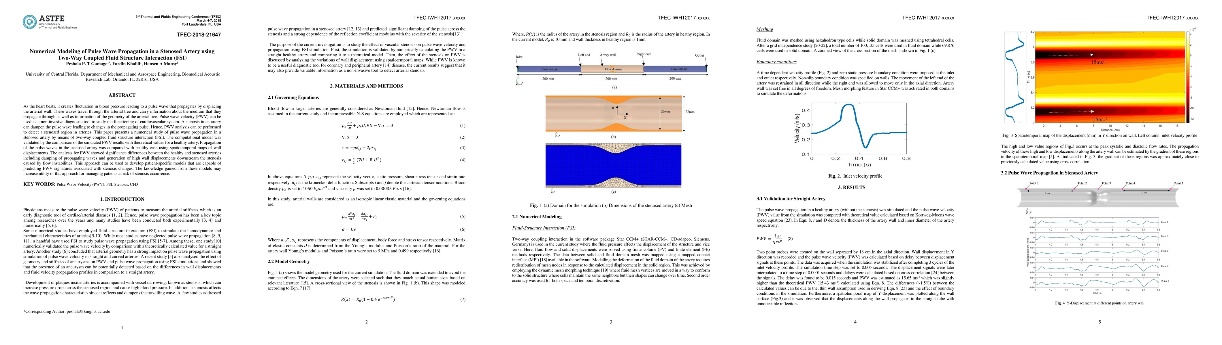 This paper numerically models pulse wave propagation in a stenosed artery using two-way coupled fluid structure interaction (FSI) to analyze changes in pulse wave velocity (PWV) due to arterial stenosis. The study validates the computational model and finds significant differences in PWV between healthy and stenosed arteries, highlighting potential for developing patient-specific models to predict and manage stenosis.