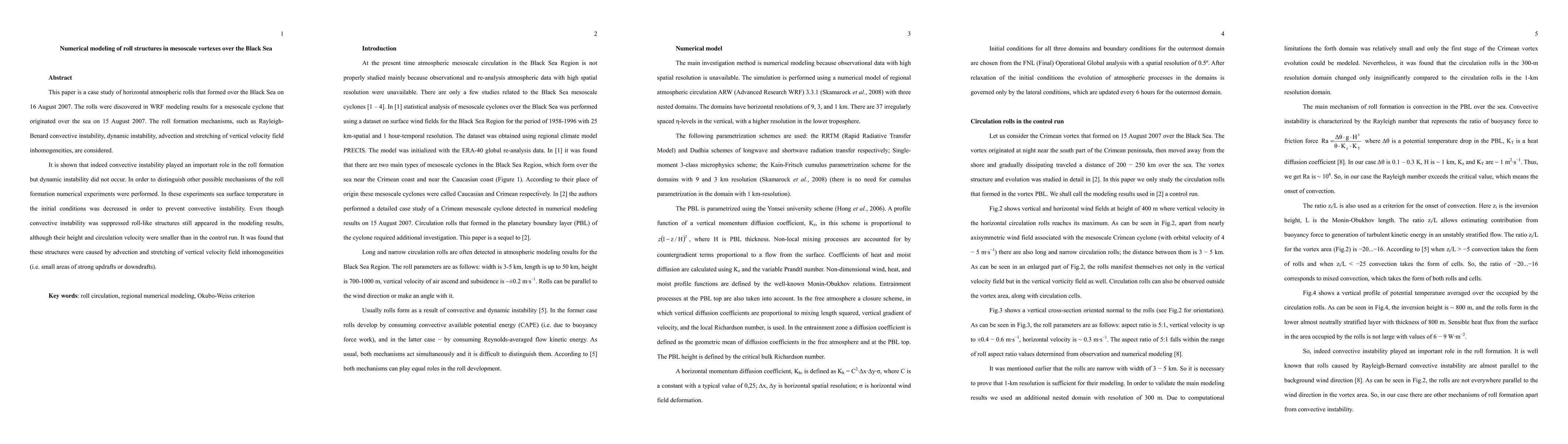 This paper is a case study of horizontal atmospheric rolls that formed over the Black Sea on 16 August 2007. The rolls were discovered in WRF modeling results for a mesoscale cyclone that originated over the sea on 15 August 2007. The roll formation mechanisms, such as Rayleigh-Benard convective instability, dynamic instability, advection and stretching of vertical velocity field inhomogeneities, are considered. It is shown that indeed convective instability played an important role in the roll formation but dynamic instability did not occur. In order to distinguish other possible mechanisms of the roll formation numerical experiments were performed. In these experiments sea surface temperature in the initial conditions was decreased in order to prevent convective instability. Even though convective instability was suppressed roll-like structures still appeared in the modeling results, although their height and circulation velocity were smaller than in the control run. It was found that these structures were caused by advection and stretching of vertical velocity field inhomogeneities (i.e. small areas of strong updrafts or downdrafts).