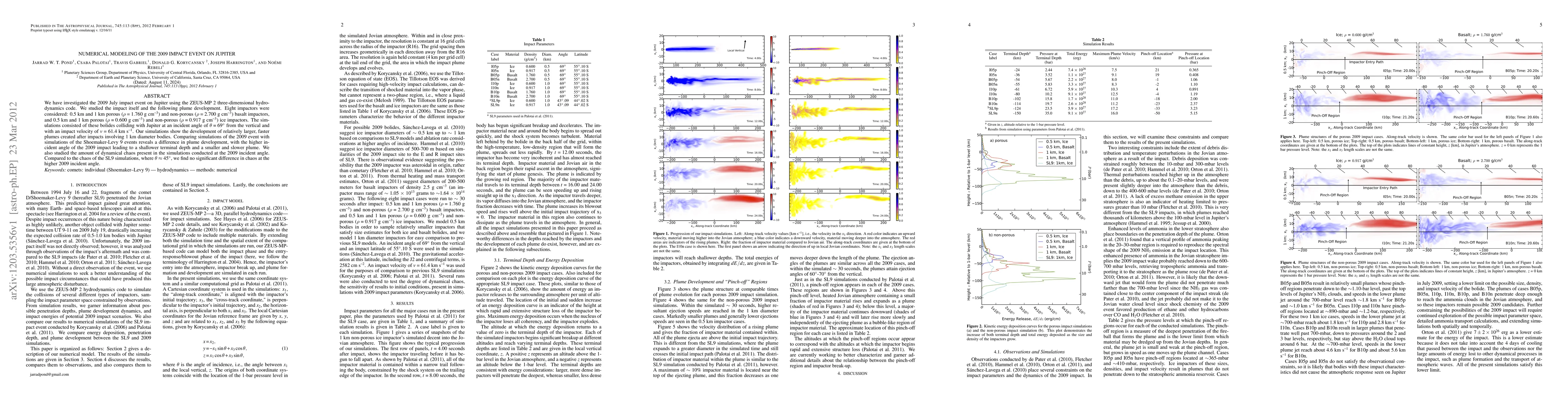 This paper uses the ZEUS-MP 2 code to model the 2009 Jupiter impact event, simulating eight different impactors to analyze plume development. Results show larger, faster plumes from 1 km diameter impacts, and a comparison with the Shoemaker-Levy 9 event indicates a shallower terminal depth and smaller plume due to the higher incident angle in 2009.