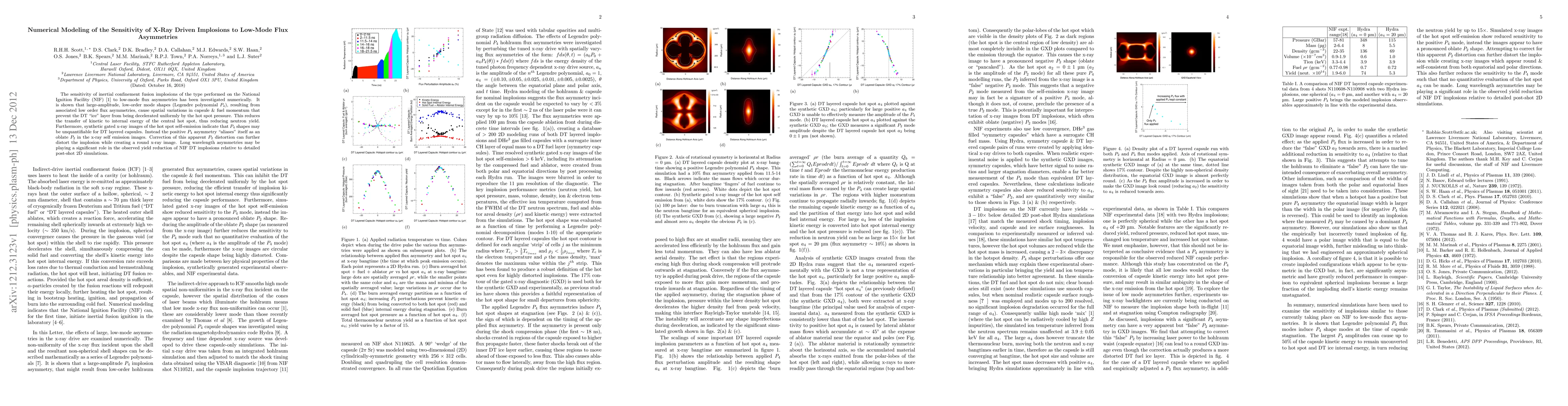 This paper numerically models the impact of low-mode flux asymmetries on X-ray driven implosions in inertial confinement fusion, showing that large-amplitude, low-order mode shapes reduce neutron yield by preventing uniform deceleration of the DT ice layer. It also highlights that P4 shapes may appear as oblate P4 in x-ray images, complicating implosion corrections.
