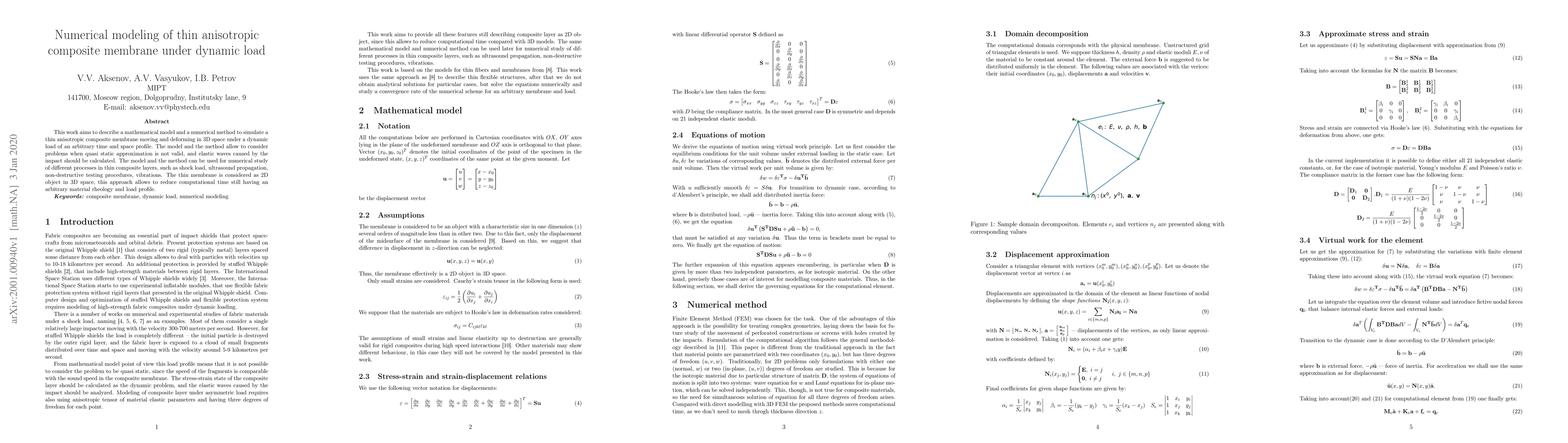 This paper presents a mathematical model and numerical method for simulating thin anisotropic composite membranes under dynamic loads, allowing for the analysis of elastic waves and non-quasi static conditions. The approach is applicable to various processes like shock loads, ultrasound propagation, and vibrations, while treating the 2D membrane in 3D space to optimize computational efficiency.