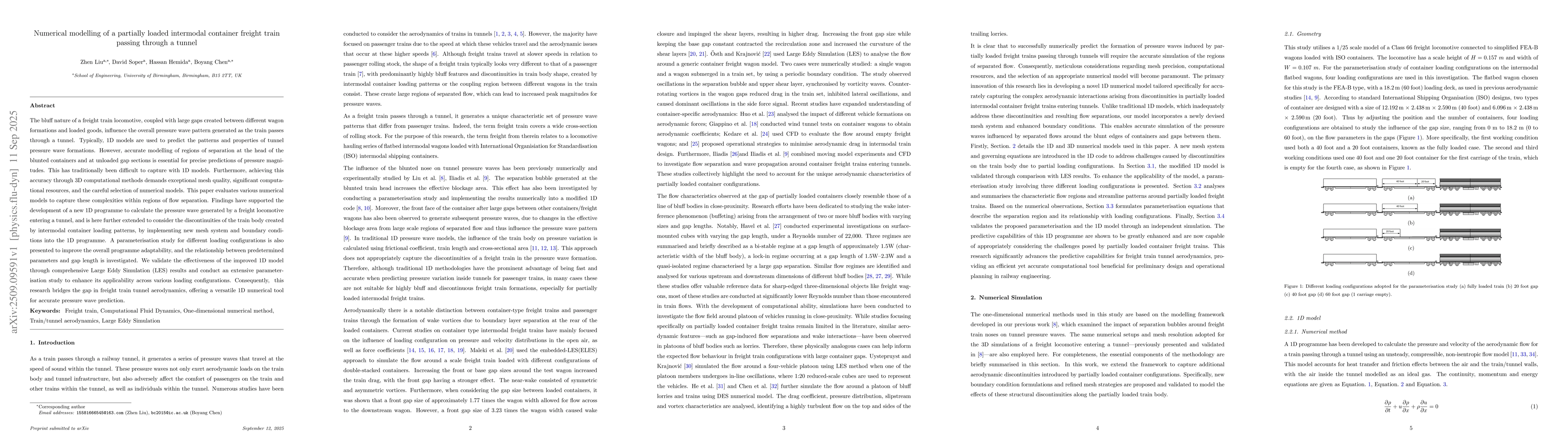 The bluff nature of a freight train locomotive, coupled with large gaps created between different wagon formations and loaded goods, influence the overall pressure wave pattern generated as the train passes through a tunnel. Typically, 1D models are used to predict the patterns and properties of tunnel pressure wave formations. However, accurate modelling of regions of separation at the head of the blunted containers and at unloaded gap sections is essential for precise predictions of pressure magnitudes. This has traditionally been difficult to capture with 1D models. Furthermore, achieving this accuracy through 3D computational methods demands exceptional mesh quality, significant computational resources, and the careful selection of numerical models. This paper evaluates various numerical models to capture these complexities within regions of flow separation. Findings have supported the development of a new 1D programme to calculate the pressure wave generated by a freight locomotive entering a tunnel, and is here further extended to consider the discontinuities of the train body created by intermodal container loading patterns, by implementing new mesh system and boundary conditions into the 1D programme. A parameterisation study for different loading configurations is also presented to improve the overall programme adaptability, and the relationship between predetermined parameters and gap length is investigated. We validate the effectiveness of the improved 1D model through comprehensive Large Eddy Simulation (LES) results and conduct an extensive parameterisation study to enhance its applicability across various loading configurations. Consequently, this research bridges the gap in freight train tunnel aerodynamics, offering a versatile 1D numerical tool for accurate pressure wave prediction.