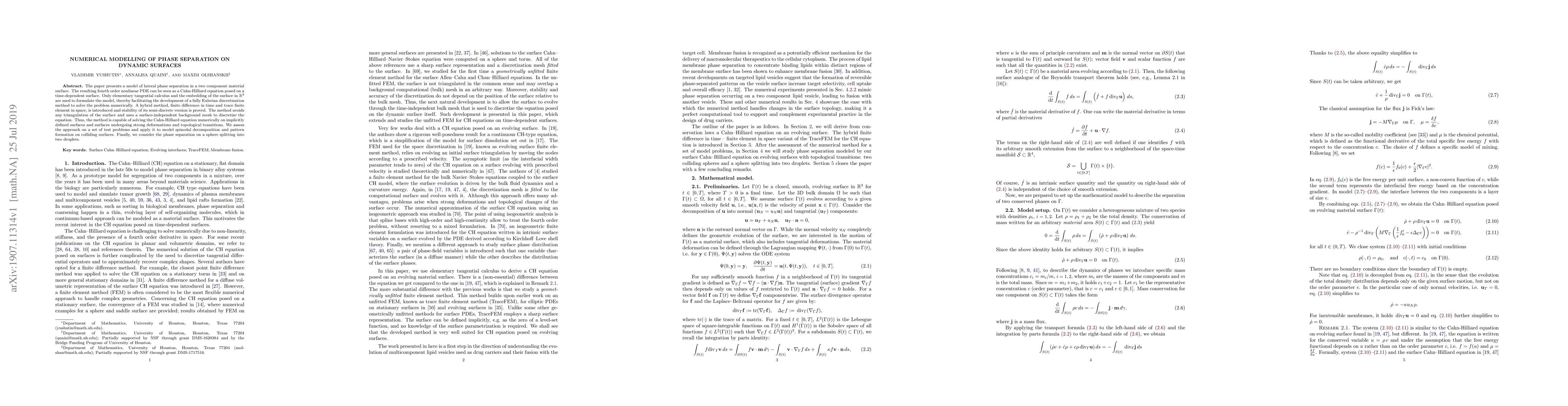The paper presents a model of lateral phase separation in a two component material surface. The resulting fourth order nonlinear PDE can be seen as a Cahn-Hilliard equation posed on a time-dependent surface. Only elementary tangential calculus and the embedding of the surface in $\mathbb{R}^3$ are used to formulate the model, thereby facilitating the development of a fully Eulerian discretization method to solve the problem numerically. A hybrid method, finite difference in time and trace finite element in space, is introduced and stability of its semi-discrete version is proved. The method avoids any triangulation of the surface and uses a surface-independent background mesh to discretize the equation. Thus, the method is capable of solving the Cahn-Hilliard equation numerically on implicitly defined surfaces and surfaces undergoing strong deformations and topological transitions. We assess the approach on a set of test problems and apply it to model spinodal decomposition and pattern formation on colliding surfaces. Finally, we consider the phase separation on a sphere splitting into two droplets.
