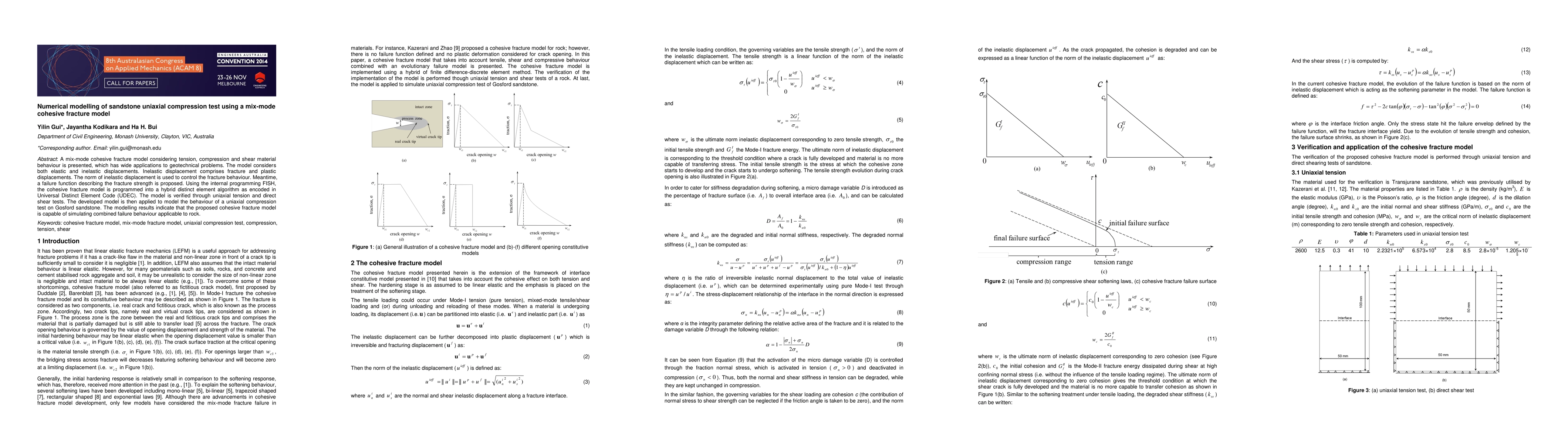 This paper presents a mix-mode cohesive fracture model for simulating the uniaxial compression test of sandstone, incorporating tension, compression, and shear behaviours. The model, implemented in UDEC using FISH, successfully simulates combined failure mechanisms in rock.