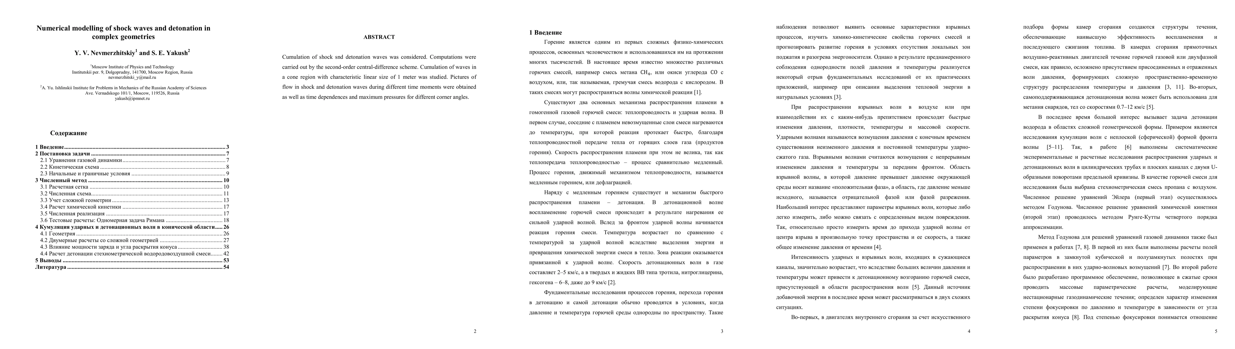 This paper numerically models shock and detonation waves in cone geometries using a second-order central-difference scheme, providing visualizations of wave propagation and analyzing time-dependent maximum pressures for various corner angles.