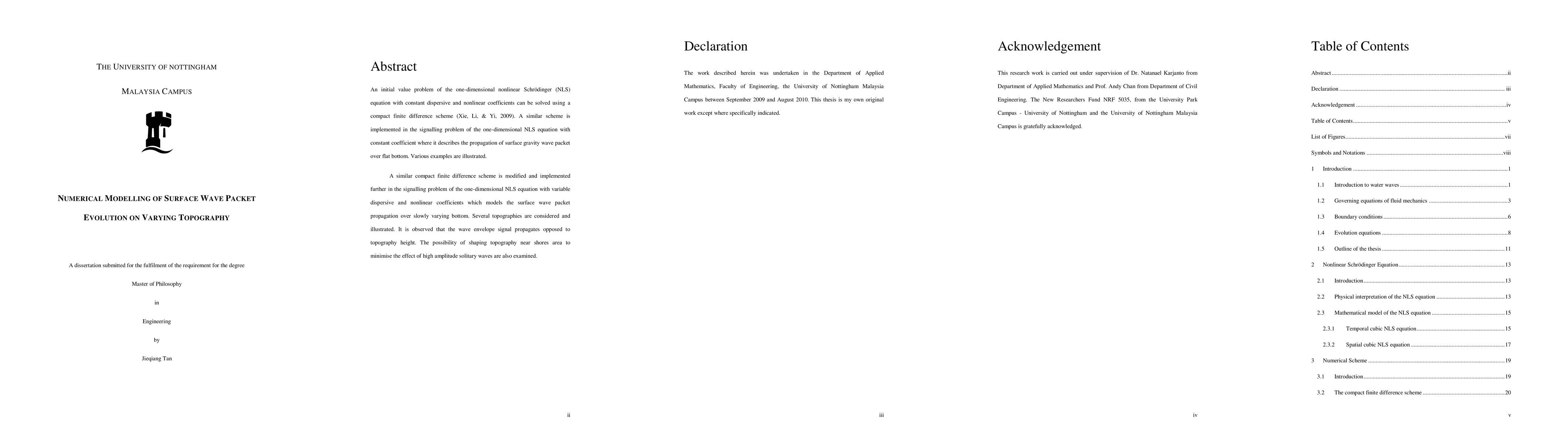 An initial value problem of the one-dimensional nonlinear Schr\"odinger (NLS) equation with constant dispersive and nonlinear coefficients can be solved using a compact finite difference scheme (Xie, Li, & Yi, 2009). A similar scheme is implemented in the signalling problem of the one-dimensional NLS equation with constant coefficient where it describes the propagation of surface gravity wave packet over a flat bottom. Various examples are illustrated. A similar compact finite difference scheme is modified and implemented further in the signalling problem of the one-dimensional NLS equation with variable dispersive and nonlinear coefficients which models the surface wave packet propagation over the slowly varying bottom. Several topographies are considered and illustrated. It is observed that the wave envelope signal propagates opposed to topography height. The possibility of shaping topography near shores area to minimise the effect of high amplitude solitary waves are also examined.