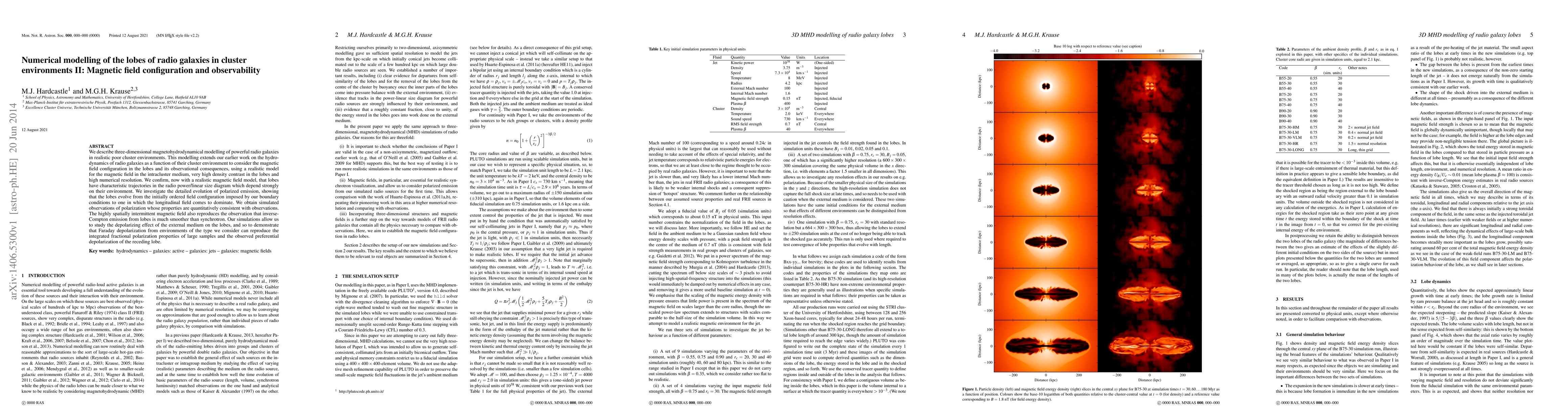 We describe three-dimensional magnetohydrodynamical modelling of powerful radio galaxies in realistic poor cluster environments. This modelling extends our earlier work on the hydrodynamics of radio galaxies as a function of their cluster environment to consider the magnetic field configuration in the lobes and its observational consequences, using a realistic model for the magnetic field in the intracluster medium, very high density contrast in the lobes and high numerical resolution. We confirm, now with a realistic magnetic field model, that lobes have characteristic trajectories in the radio power/linear size diagram which depend strongly on their environment. We investigate the detailed evolution of polarized emission, showing that the lobes evolve from the initially ordered field configuration imposed by our boundary conditions to one in which the longitudinal field comes to dominate. We obtain simulated observations of polarization whose properties are quantitatively consistent with observations. The highly spatially intermittent magnetic field also reproduces the observation that inverse-Compton emission from lobes is much smoother than synchrotron. Our simulations allow us to study the depolarizing effect of the external medium on the lobes, and so to demonstrate that Faraday depolarization from environments of the type we consider can reproduce the integrated fractional polarization properties of large samples and the observed preferential depolarization of the receding lobe.
