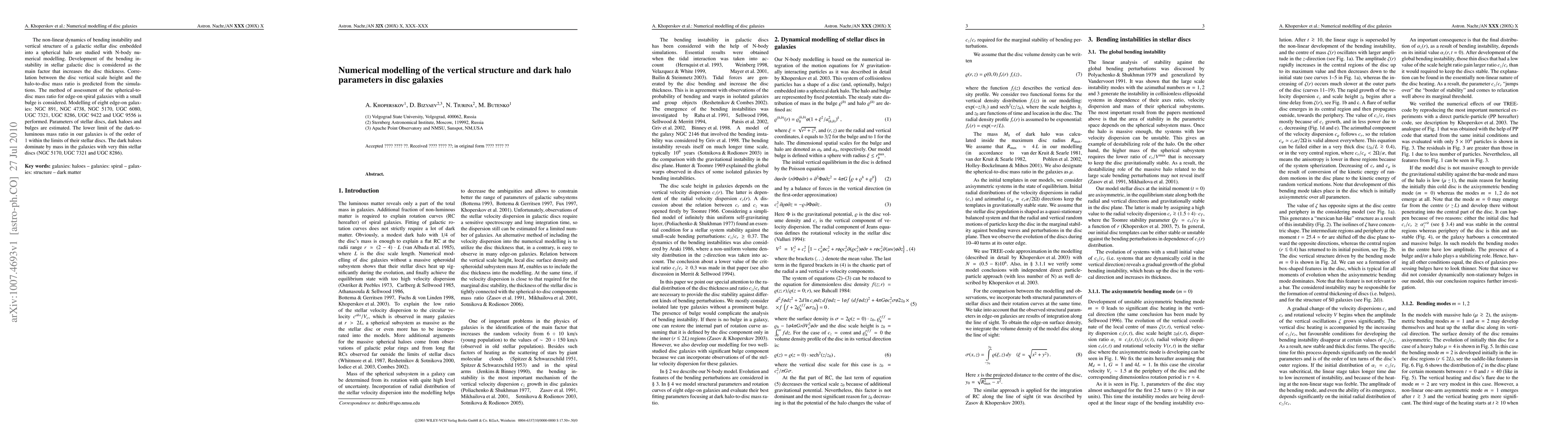 This paper uses N-body numerical modelling to study the bending instability and vertical structure of galactic stellar discs embedded in dark halos, predicting a correlation between the disc's vertical scale height and the halo-to-disc mass ratio. It estimates the dark-to-luminous mass ratio in eight edge-on spiral galaxies, finding that dark haloes dominate in galaxies with thin stellar discs.