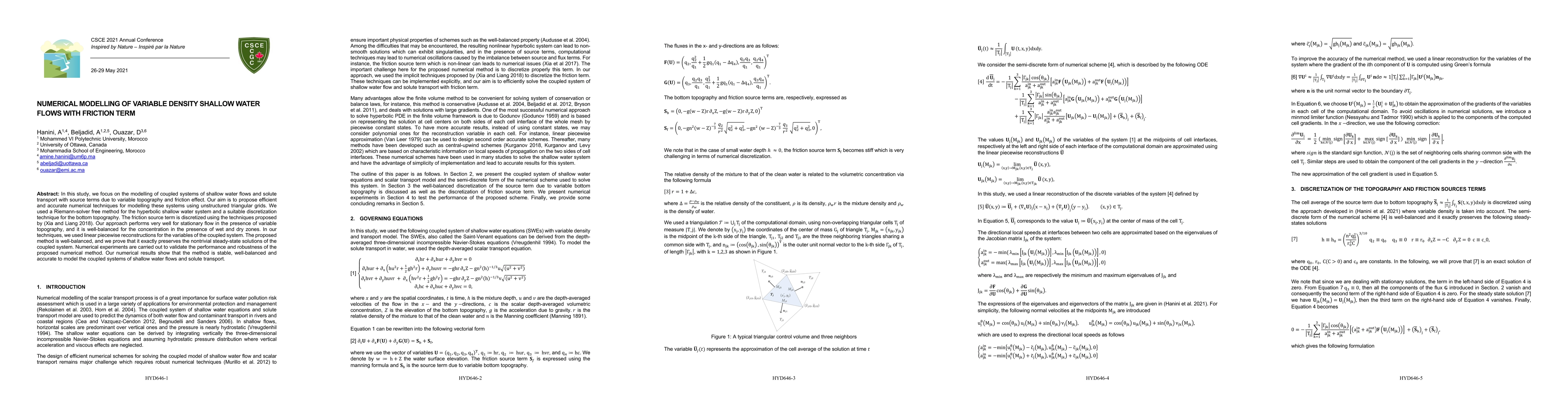 This paper proposes efficient numerical techniques for modelling variable density shallow water flows and solute transport, incorporating variable topography and friction effects. The method uses unstructured triangular grids and demonstrates stability, accuracy, and well-balancing, validated through numerical experiments.