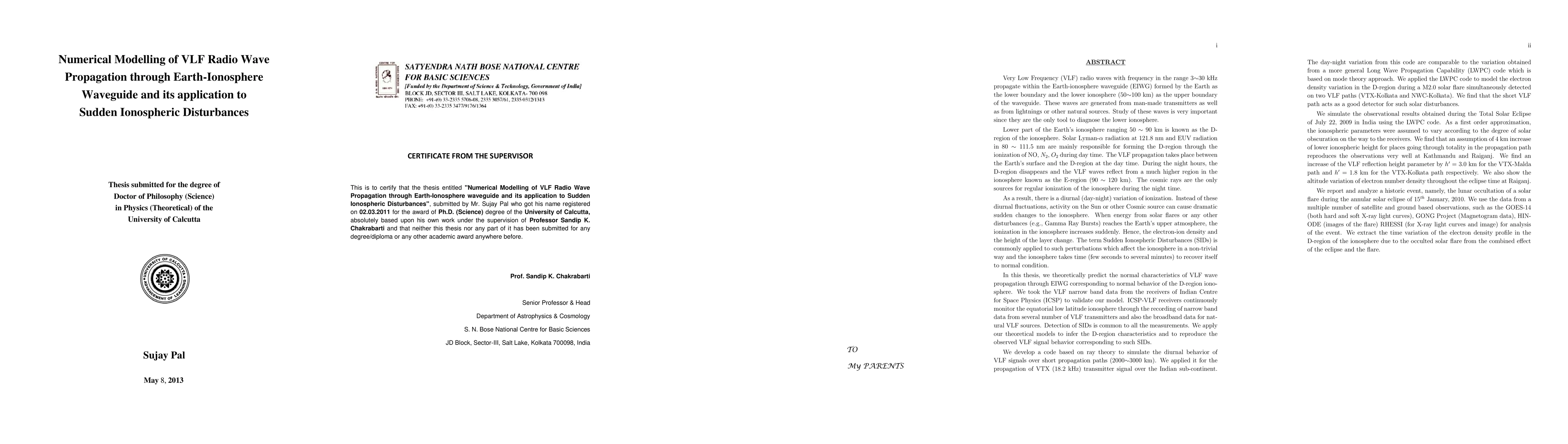 This research develops a numerical model based on ray theory to simulate VLF radio wave propagation through the Earth-ionosphere waveguide, validating it with data from Indian Centre for Space Physics. The model is applied to study sudden ionospheric disturbances (SIDs) and their effects on VLF signals, including events like the 2009 solar eclipse and a 2010 lunar occultation of a solar flare.