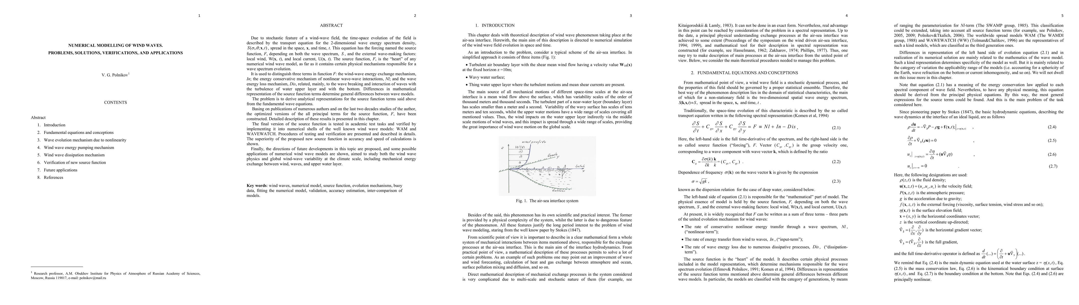 The time-space evolution of the field is described by the transport equation for the 2-dimensional wave energy spectrum density, S(x,t), spread in the space, x, and time, t. This equation has the forcing named the source function, F, depending on both the wave spectrum, S, and the external wave-making factors: local wind, W(x, t), and local current, U(x, t). The source function contains certain physical mechanisms responsible for a wave spectrum evolution. It is used to distinguish three terms in function F: the wind-wave energy exchange mechanism, In; the energy conservative mechanism of nonlinear wave-wave interactions, Nl; and the wave energy loss mechanism, Dis. Differences in mathematical representation of the source function terms determine general differences between wave models. The problem is to derive analytical representations for the source function terms said above from the fundamental wave equations. Basing on publications of numerous authors and on the last two decades studies of the author, the optimized versions of the all principal terms for the source function, F, have been constructed. Detailed description of these results is presented. The final version of the source function is tested in academic test tasks and verified by implementing it into numerical shells of the well known wind wave models: WAM and WAVEWATCH. Procedures of testing and verification are presented and described in details. The superiority of the proposed new source function in accuracy and speed of calculations is shown. Finally, the directions of future developments in this topic are proposed, and some possible applications of numerical wind wave models are shown, aimed to study both the wind wave physics and global wind-wave variability at the climate scale, including mechanical energy exchange between wind, waves, and upper water layer.