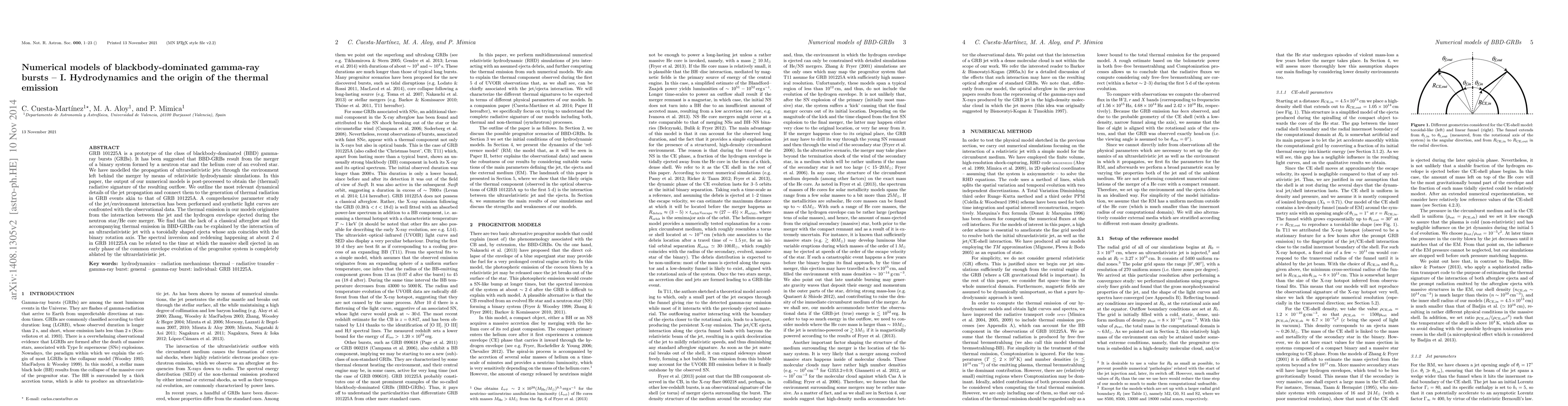 GRB 101225A is a prototype of the class of blackbody-dominated (BBD) gamma-ray bursts (GRBs). It has been suggested that BBD-GRBs result from the merger of a binary system formed by a neutron star and the helium core of an evolved star. We have modelled the propagation of ultrarelativistic jets through the environment left behind the merger by means of relativistic hydrodynamic simulations. In this paper, the output of our numerical models is post-processed to obtain the (thermal) radiative signature of the resulting outflow. We outline the most relevant dynamical details of the jet propagation and connect them to the generation of thermal radiation in GRB events akin to that of GRB 101225A. A comprehensive parameter study of the jet/environment interaction has been performed and synthetic light curves are confronted with the observational data. The thermal emission in our models originates from the interaction between the jet and the hydrogen envelope ejected during the neutron star/He core merger. We find that the lack of a classical afterglow and the accompanying thermal emission in BBD-GRBs can be explained by the interaction of an ultrarelativistic jet with a toroidally shaped ejecta whose axis coincides with the binary rotation axis. The spectral inversion and reddening happening at about 2 d in GRB 101225A can be related to the time at which the massive shell ejected in an early phase of the common envelope evolution of the progenitor system is completely ablated by the ultrarelativistic jet.