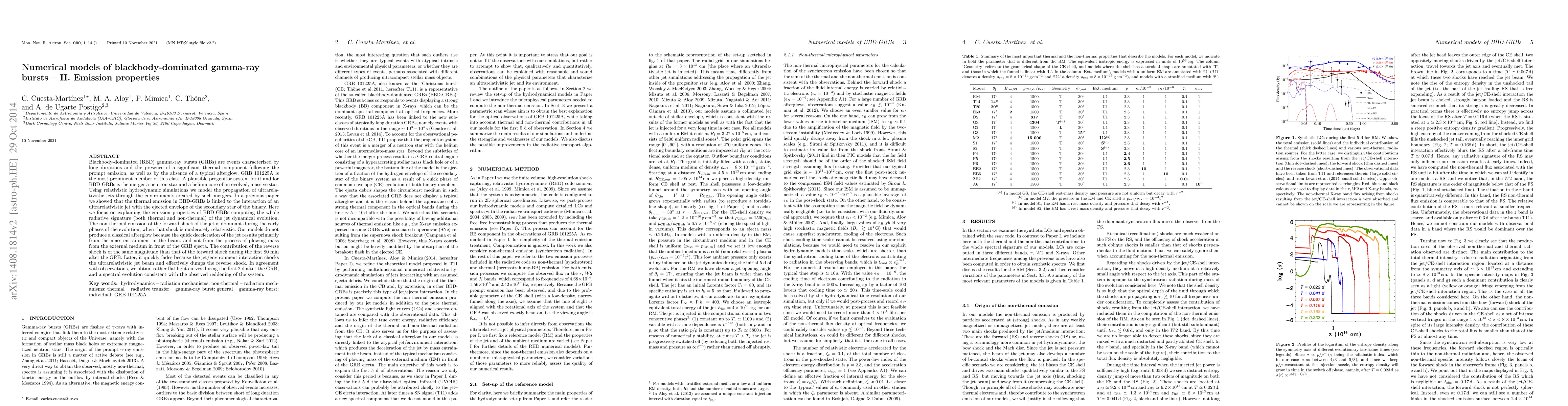 Blackbody-dominated (BBD) gamma-ray bursts (GRBs) are events characterized by long durations and the presence of a significant thermal component following the prompt emission, as well as by the absence of a typical afterglow. GRB 101225A is the most prominent member of this class. A plausible progenitor system for it and for BBD-GRBs is the merger a neutron star and a helium core of an evolved, massive star. Using relativistic hydrodynamic simulations we model the propagation of ultrarelativistic jets through the environments created by such mergers. In a previous paper we showed that the thermal emission in BBD-GRBs is linked to the interaction of an ultrarelativistic jet with the ejected envelope of the secondary star of the binary. Here we focus on explaining the emission properties of BBD-GRBs computing the whole radiative signature (both thermal and non-thermal) of the jet dynamical evolution. The non-thermal emission of the forward shock of the jet is dominant during the early phases of the evolution, when that shock is moderately relativistic. Our models do not produce a classical afterglow because the quick deceleration of the jet results primarily from the mass entrainment in the beam, and not from the process of plowing mass from the external medium in front of the GRB ejecta. The contribution of the reverse shock is of the same magnitude than that of the forward shock during the first 80 min after the GRB. Later, it quickly fades because the jet/environment interaction chocks the ultrarelativistic jet beam and effectively dumps the reverse shock. In agreement with observations, we obtain rather flat light curves during the first 2 d after the GRB, and a spectral evolution consistent with the observed reddening of the system.