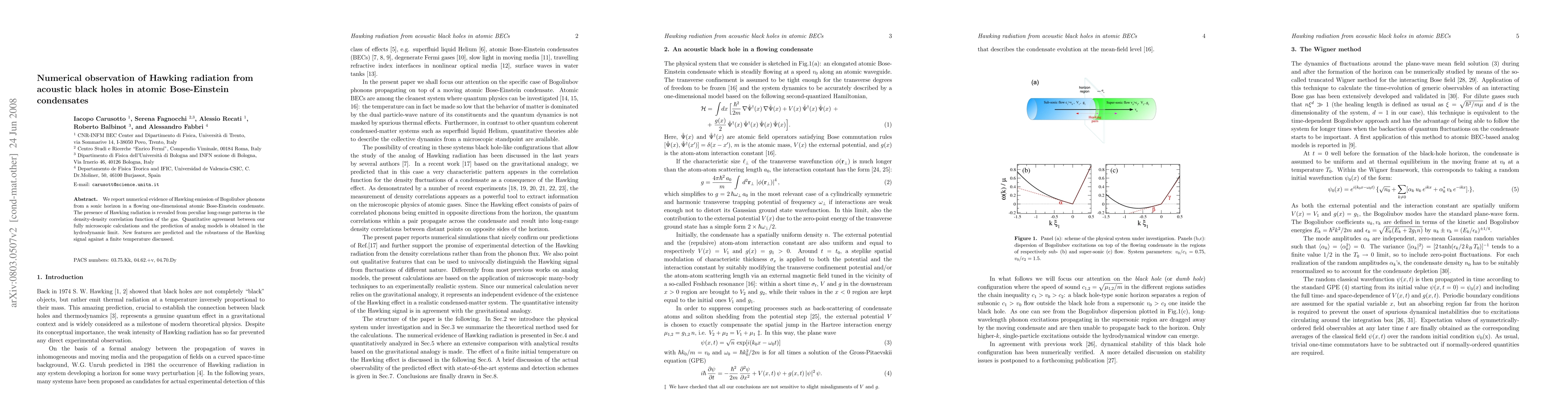 This paper provides numerical evidence for Hawking radiation in a flowing Bose-Einstein condensate, revealing it through long-range density correlations and confirming predictions from analog models in the hydrodynamic limit. The study also discusses the robustness of this Hawking signal against finite temperatures.