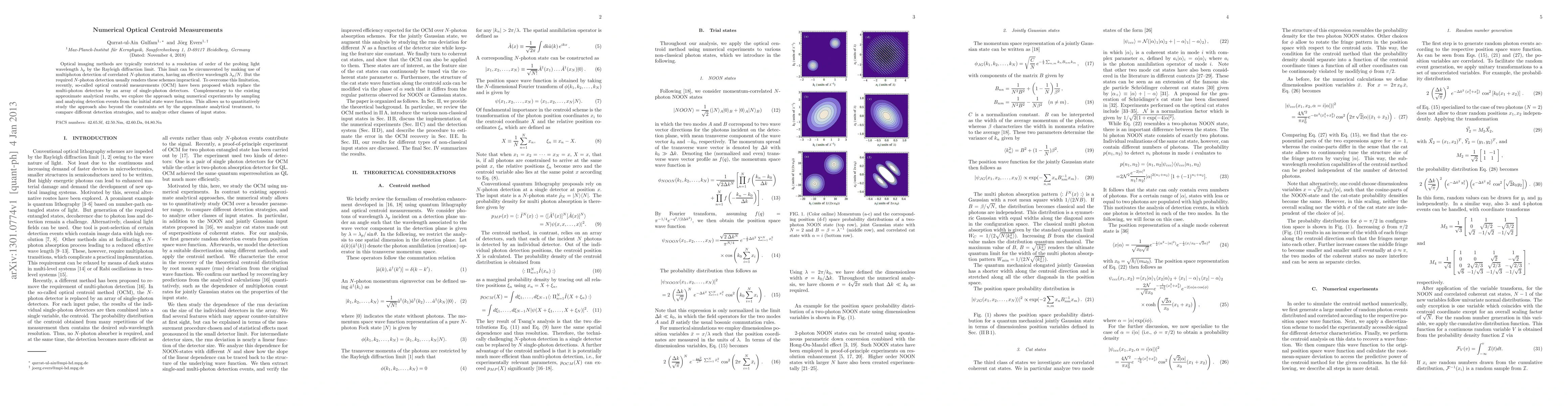 Optical imaging methods are typically restricted to a resolution of order of the probing light wavelength $\lambda_p$ by the Rayleigh diffraction limit. This limit can be circumvented by making use of multiphoton detection of correlated $N$-photon states, having an effective wavelength $\lambda_p/N$. But the required $N$-photon detection usually renders these schemes impractical. To overcome this limitation, recently, so-called optical centroid measurements (OCM) have been proposed which replace the multi-photon detectors by an array of single-photon detectors. Complementary to the existing approximate analytical results, we explore the approach using numerical experiments by sampling and analyzing detection events from the initial state wave function. This allows us to quantitatively study the approach also beyond the constraints set by the approximate analytical treatment, to compare different detection strategies, and to analyze other classes of input states.