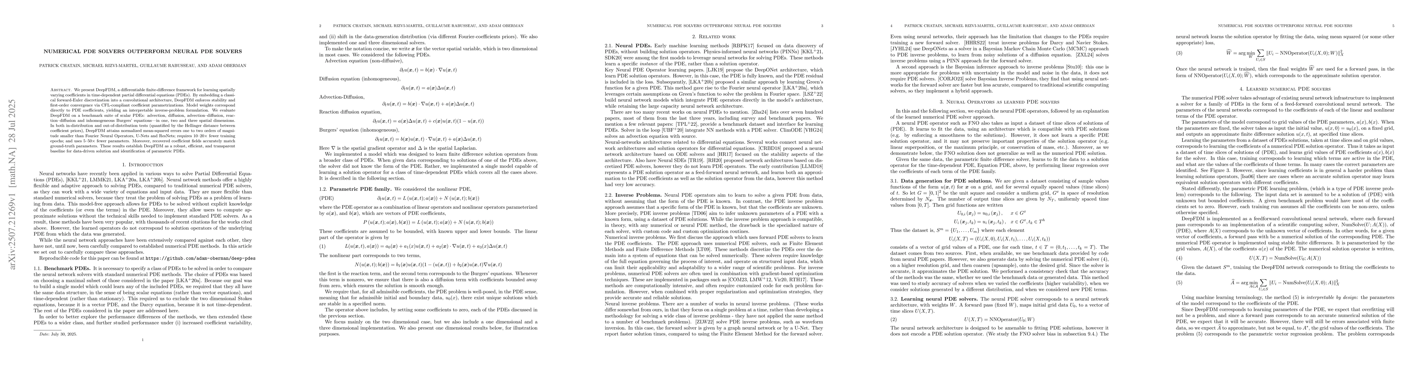 We present DeepFDM, a differentiable finite-difference framework for learning spatially varying coefficients in time-dependent partial differential equations (PDEs). By embedding a classical forward-Euler discretization into a convolutional architecture, DeepFDM enforces stability and first-order convergence via CFL-compliant coefficient parameterizations. Model weights correspond directly to PDE coefficients, yielding an interpretable inverse-problem formulation. We evaluate DeepFDM on a benchmark suite of scalar PDEs: advection, diffusion, advection-diffusion, reaction-diffusion and inhomogeneous Burgers' equations-in one, two and three spatial dimensions. In both in-distribution and out-of-distribution tests (quantified by the Hellinger distance between coefficient priors), DeepFDM attains normalized mean-squared errors one to two orders of magnitude smaller than Fourier Neural Operators, U-Nets and ResNets; requires 10-20X fewer training epochs; and uses 5-50X fewer parameters. Moreover, recovered coefficient fields accurately match ground-truth parameters. These results establish DeepFDM as a robust, efficient, and transparent baseline for data-driven solution and identification of parametric PDEs.