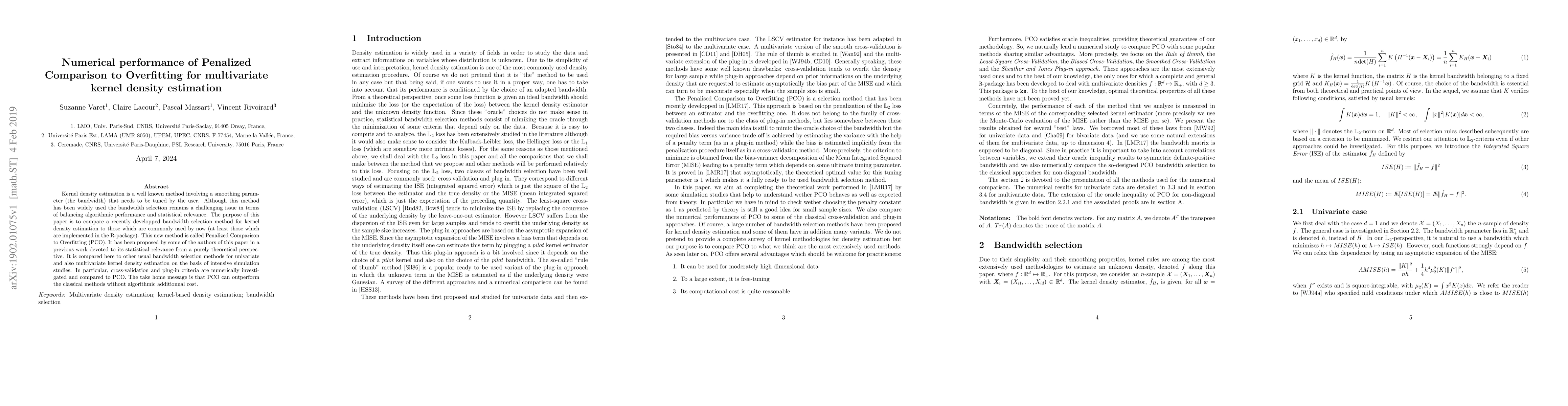 Kernel density estimation is a well known method involving a smoothing parameter (the bandwidth) that needs to be tuned by the user. Although this method has been widely used the bandwidth selection remains a challenging issue in terms of balancing algorithmic performance and statistical relevance. The purpose of this paper is to compare a recently developped bandwidth selection method for kernel density estimation to those which are commonly used by now (at least those which are implemented in the R-package). This new method is called Penalized Comparison to Overfitting (PCO). It has been proposed by some of the authors of this paper in a previous work devoted to its statistical relevance from a purely theoretical perspective. It is compared here to other usual bandwidth selection methods for univariate and also multivariate kernel density estimation on the basis of intensive simulation studies. In particular, cross-validation and plug-in criteria are numerically investigated and compared to PCO. The take home message is that PCO can outperform the classical methods without algorithmic additionnal cost.