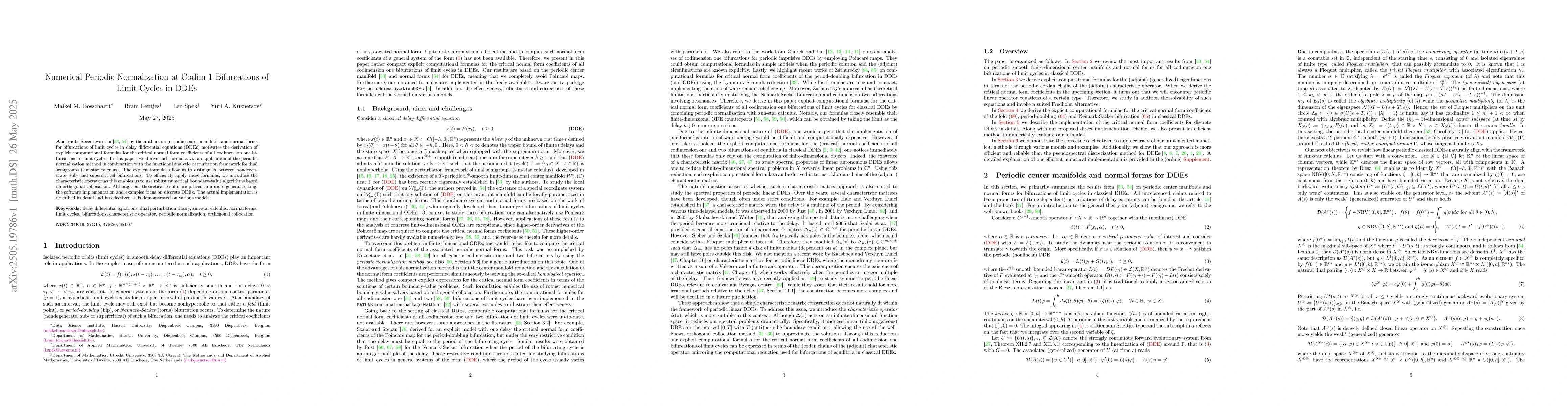 The research derives explicit computational formulas for critical normal form coefficients of codimension one bifurcations of limit cycles in DDEs using periodic normalization and sun-star calculus. It introduces the characteristic operator for efficient numerical application via orthogonal collocation.