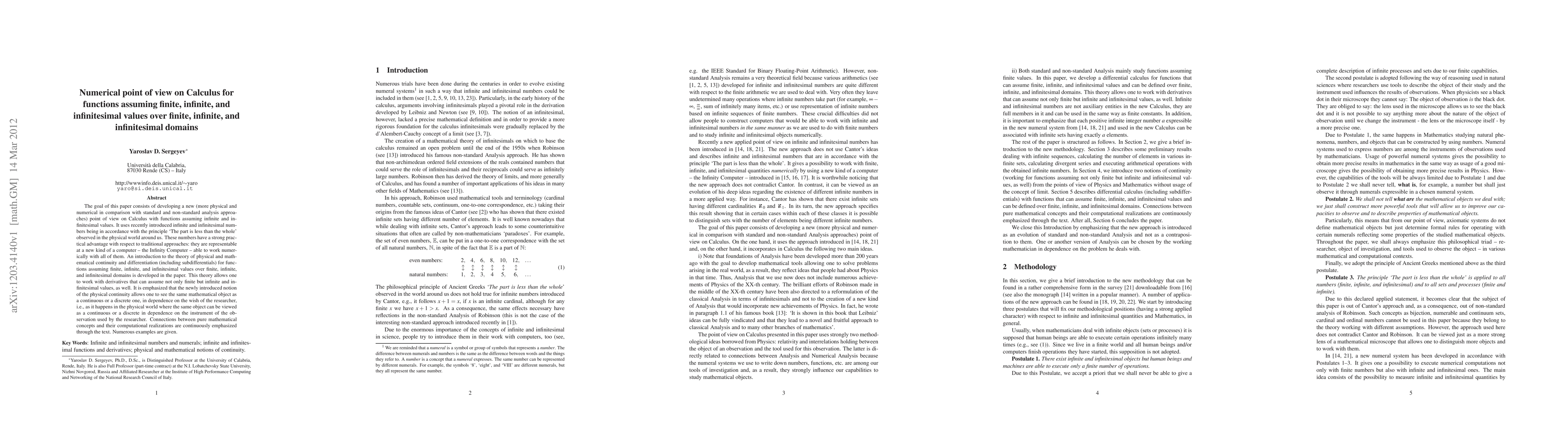 This paper introduces a novel numerical approach to Calculus that accommodates functions with infinite and infinitesimal values, utilizing a new Infinity Computer. It develops a theory of physical continuity and differentiation, allowing derivatives to assume infinite and infinitesimal values, and emphasizes the flexibility to view mathematical objects as continuous or discrete.