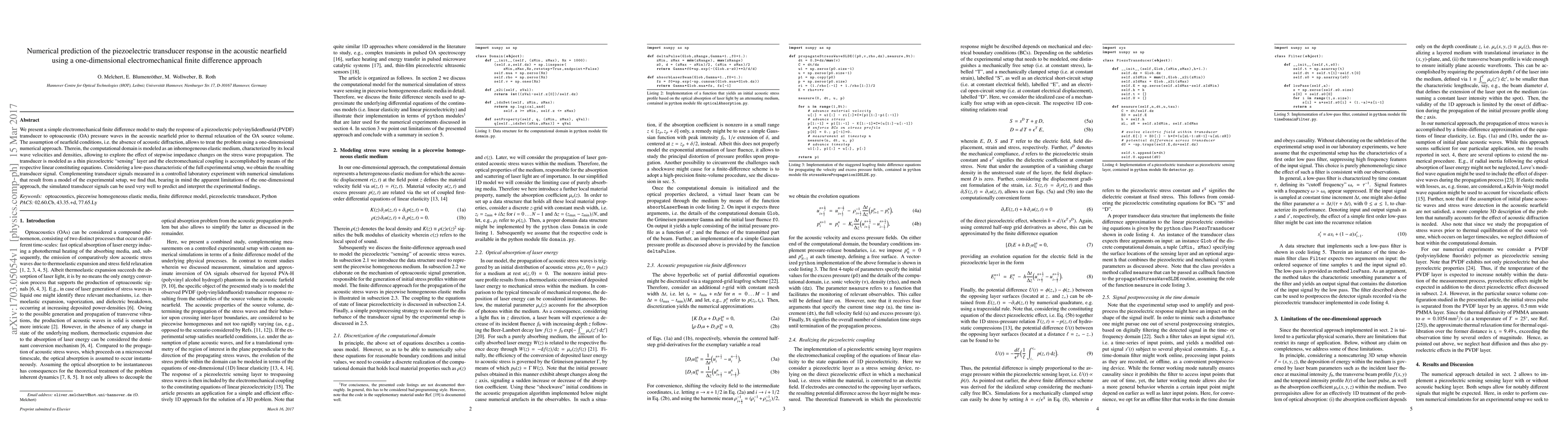 We present a simple electromechanical finite difference model to study the response of a piezoelectric polyvinylidenflourid (PVDF) transducer to optoacoustic (OA) pressure waves in the acoustic nearfield prior to thermal relaxation of the OA source volume. The assumption of nearfield conditions, i.e. the absence of acoustic diffraction, allows to treat the problem using a one-dimensional numerical approach. Therein, the computational domain is modeled as an inhomogeneous elastic medium, characterized by its local wave velocities and densities, allowing to explore the effect of stepwise impedance changes on the stress wave propagation. The transducer is modeled as a thin piezoelectric sensing layer and the electromechanical coupling is accomplished by means of the respective linear constituting equations. Considering a low-pass characteristic of the full experimental setup, we obtain the resulting transducer signal. Complementing transducer signals measured in a controlled laboratory experiment with numerical simulations that result from a model of the experimental setup, we find that, bearing in mind the apparent limitations of the one-dimensional approach, the simulated transducer signals can be used very well to predict and interpret the experimental findings.