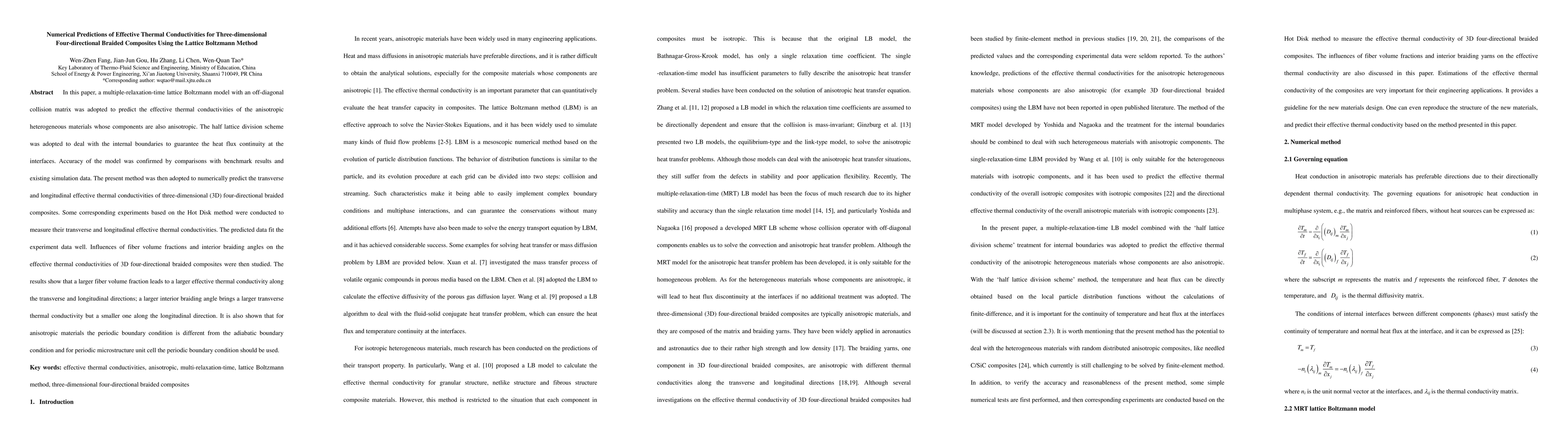 This paper uses a lattice Boltzmann method to predict the effective thermal conductivities of 3D four-directional braided composites, showing that fiber volume fractions and braiding angles significantly influence thermal conductivity. Experimental results using the Hot Disk method validate the model's accuracy.